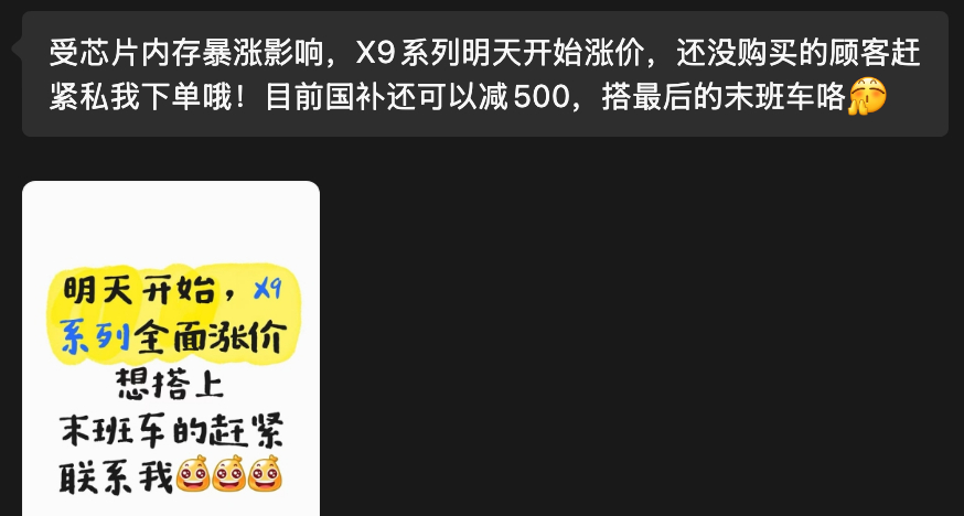 emmmm,收到门店销售的消息,X9系列明天开始也要调价了。再重温一下之前的价格据说普遍是涨500。这个趋势,接下来X9 Ultra的定价......