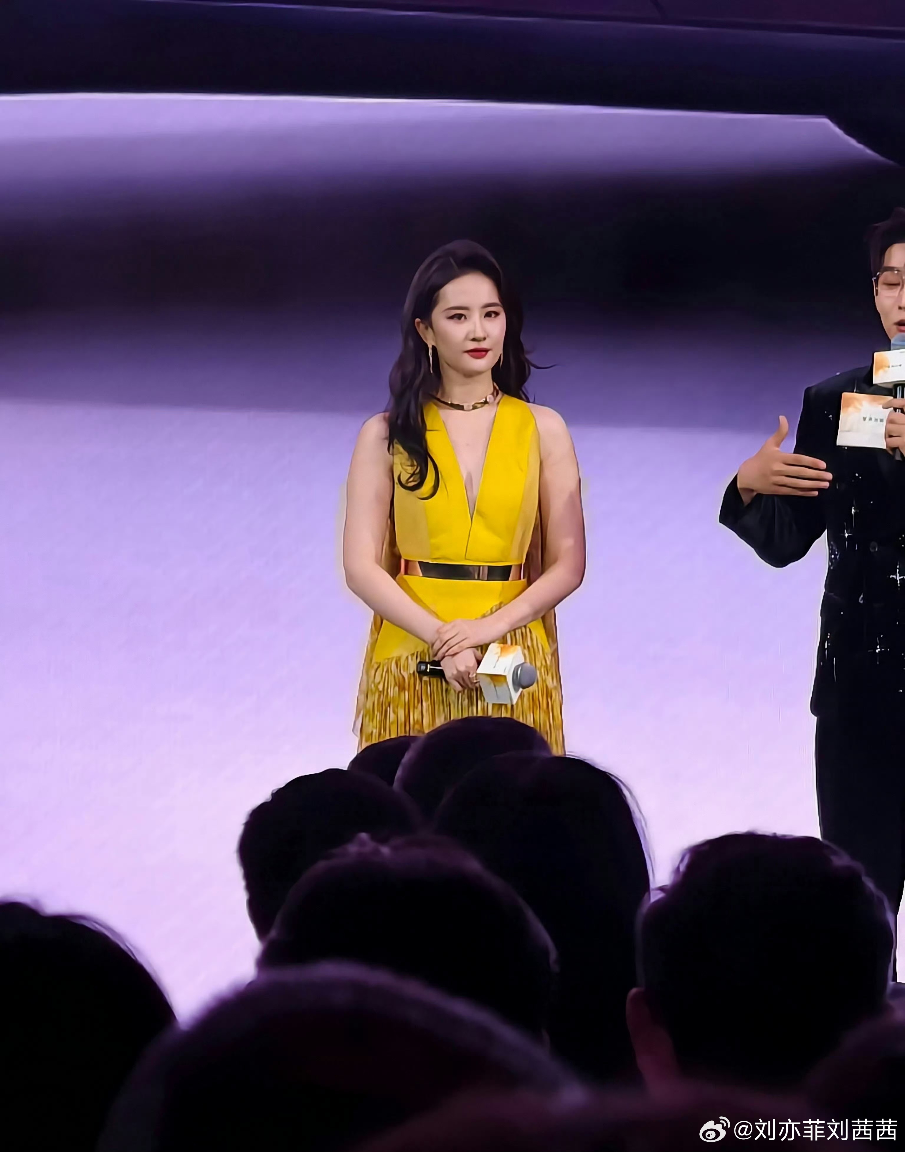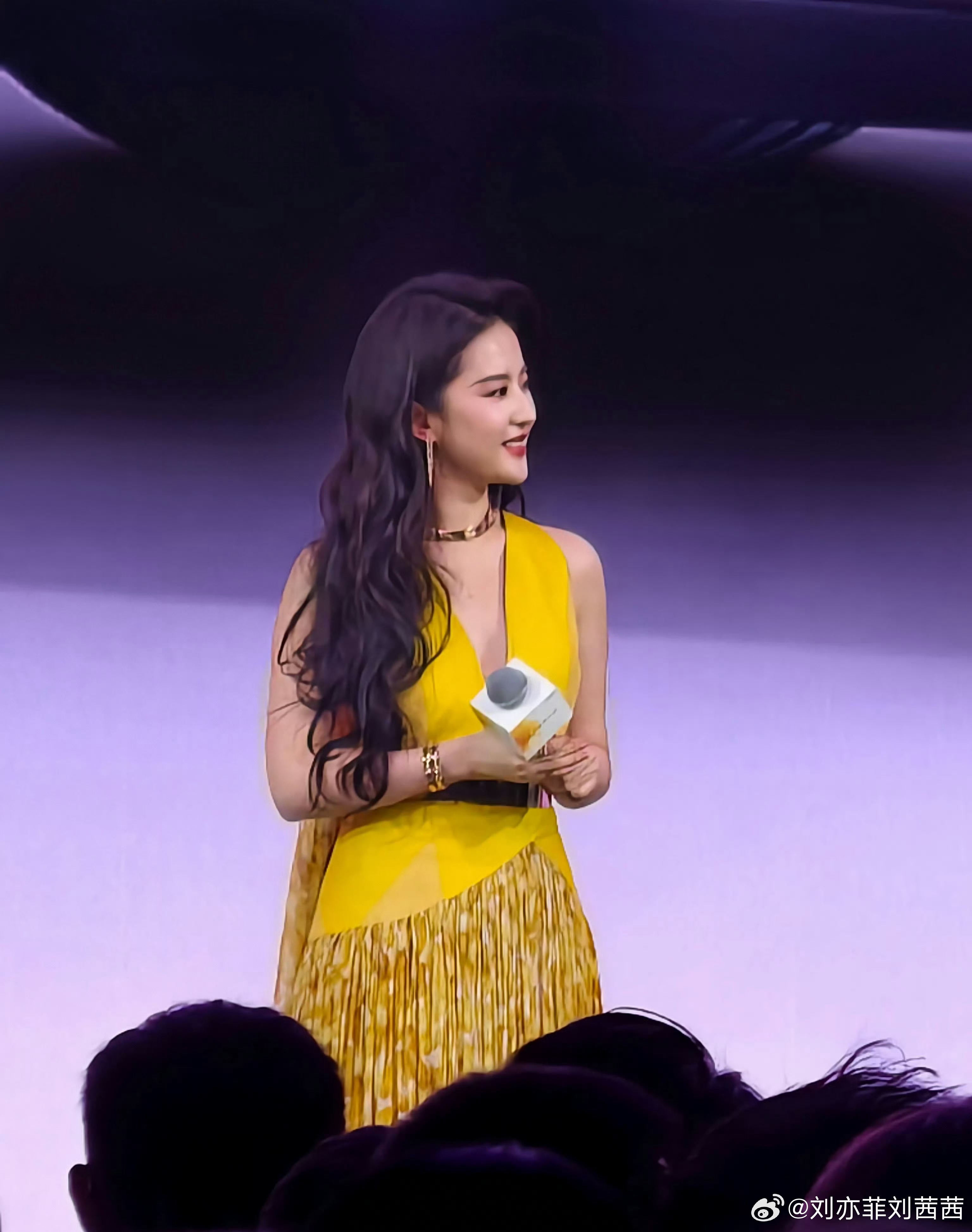 刘亦菲这套造型以高饱和亮色为核心,明黄色深V挂脖礼服勾勒出优越肩颈线条,挂脖设计