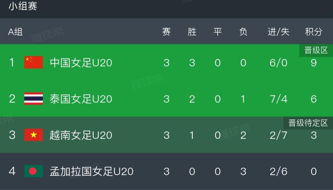 U20女足亚洲杯一夜两场1-0! 中国女足全胜战绩,小组第1突围! 越南女足保留晋级希望! 北京时间4月7日,U20女足亚洲杯,A组第三轮的角逐。 ①越南1-0孟加拉国。 两支队伍上半场交白卷,下半场刚回来越南女足的机会来了,通过定位球开到禁区,孟加拉国队门将试图摘球却脱手送大礼,阮式翠玲近距离轻松补射得手,她们打破平衡之后是稳扎稳打的策略,最终守住1-0的胜利,这也是队伍的首胜,同时保留晋级淘汰赛的希望(争夺两个成绩最好的小组第三的顺位)。 ②中国1-0泰国。 中国女足迅速掌控节奏,持续不断施压造险,曾雨佳第15分钟进球被吹越位,这次判罚是引起争议,队伍耐心组织串联,终于第29分钟肖亚飞超远距离突施冷箭,造成门将脱手入网(1-0),随即不久余佳琪获得单刀良机,可惜击中门框差之毫厘。 易边再战节奏放缓,泰国队偶尔创造反击机会,但给予的威胁非常有限。中国队逐渐加强防守,再无特别强力的进攻压制,剩余时间再无建树,1比0告捷,小组赛三战全胜且零失球,锁定A组头名出线。