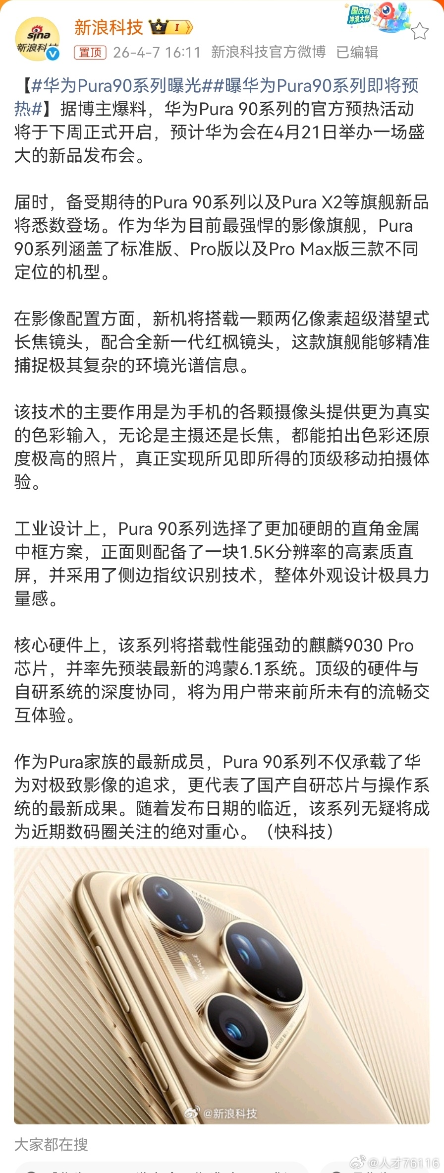 【华为Pura90系列曝光,将搭载一颗两亿像素超级潜望式长焦镜头,配合全新一代红枫镜头】华为Pura 90系列的官方预热活动将于下周正式开启,预计发布会时间在4月21日左右,Pura 90系列以及Pura X2等旗舰新品将悉数登场。 根据快科技等媒体报道,机型方面,作为华为的影像旗舰,Pura 90系列涵盖了标准版、Pro版以及Pro Max版三款不同定位的机型。