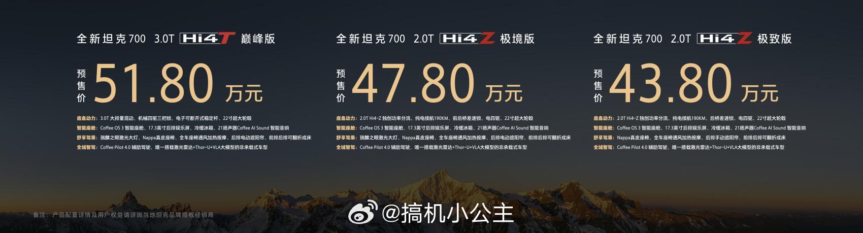 最近全新坦克700开启预售啦,官方预售价43.80万-51.80万元,推出3.0T Hi4-T、2.0T Hi4-Z两大动力版本共3款车型,定位全域豪华SUV新旗舰,开创全域豪华新品类,可满足商务、家用、越野等全场景出行需求。新车以麒麟为设计灵感,融入东方文化底蕴,打造专属配色与对称式座舱,尽显中国旗舰气韵;搭载VLA大模型,配备Coffee Pilot 4.0智驾、Coffee OS 3座舱系统,实现全链路NOA、多屏交互等智能体验,科技感拉满。双旗舰动力性能强悍,补能效率升级,还拥有五层滤振体系及螺簧、空簧双方案,兼顾越野性能与舒适体验,感兴趣的朋友可以关注下~全新坦克700新时代新旗舰全新坦克700全域豪华suv新旗舰跟着魏建军看懂全新坦克700魏建军的摩登DAY全新坦克700预售43.8万元起