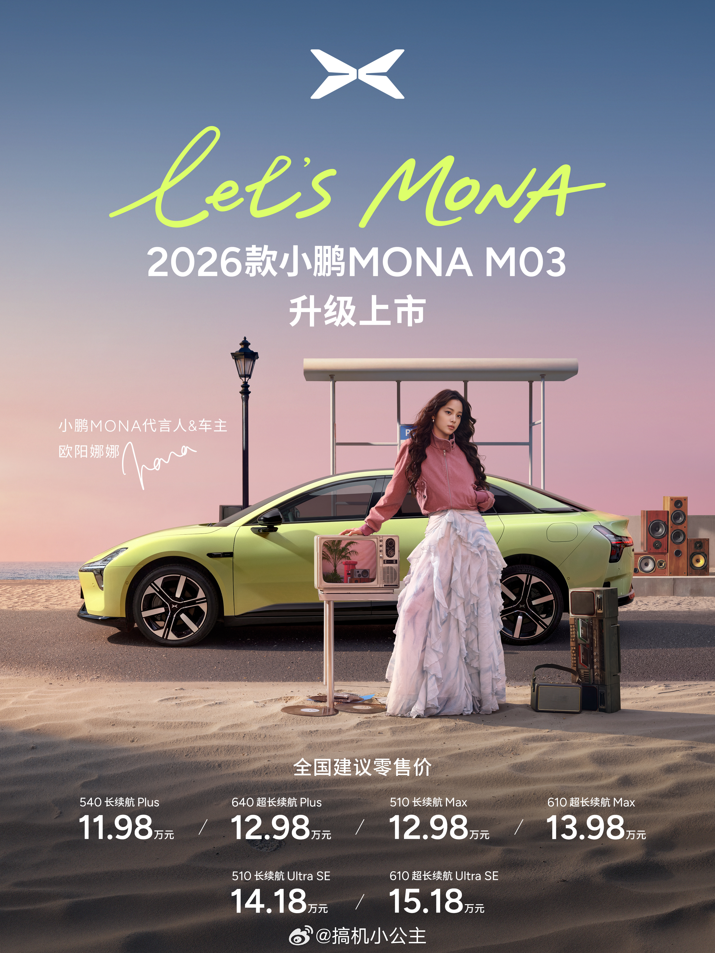 2026款小鹏MONA M03在广州正式上市,这款面向年轻用户的AI智能纯电轿跑共推出6款版型,官方指导价11.98万-15.18万元,4月30日前下定可享至高35000元上市专属权益。此次首次大升级以20万级为开发基准,在精致感、配置、智驾上全面进阶。外观新增配色并升级工艺,内饰强化质感且配备女性友好的美妆镜等贴心配置;舒适、能耗、驾控、安全维度均越级,CLTC续航最高640km,刹停距离领先行业。智驾提供双算力版本,Ultra SE版搭载第二代VLA,智能座舱升级天玑AIOS 6.0系统,拥有3D车道级导航等功能,以越级实力重新定义A级纯电轿车价值标杆👏2026款小鹏MONA大大大大大升级