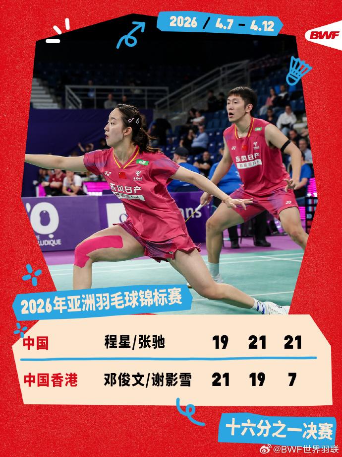 程星/张驰两位相对年轻的选手第一轮就遭遇硬茬,对阵上届亚锦赛冠军得主、中国香港的邓俊文/谢影雪。程星/张驰首局局末在关键分上处理得不够好,结果以19比21输掉了第一局。第二局在11比17落后几乎陷入绝境的情况下,程星/张弛调整了心态,1分1分往回扳,愣是追回了分差,以21比19的比分回敬了对手一局。该拿下的比赛没有拿下,邓俊文/谢影雪的心态崩了,决胜局程星和张弛越打越顺,士气高涨,以21比7大胜,大比分2比1实现了逆转,淘汰卫冕冠军的同时也晋级到了16强。