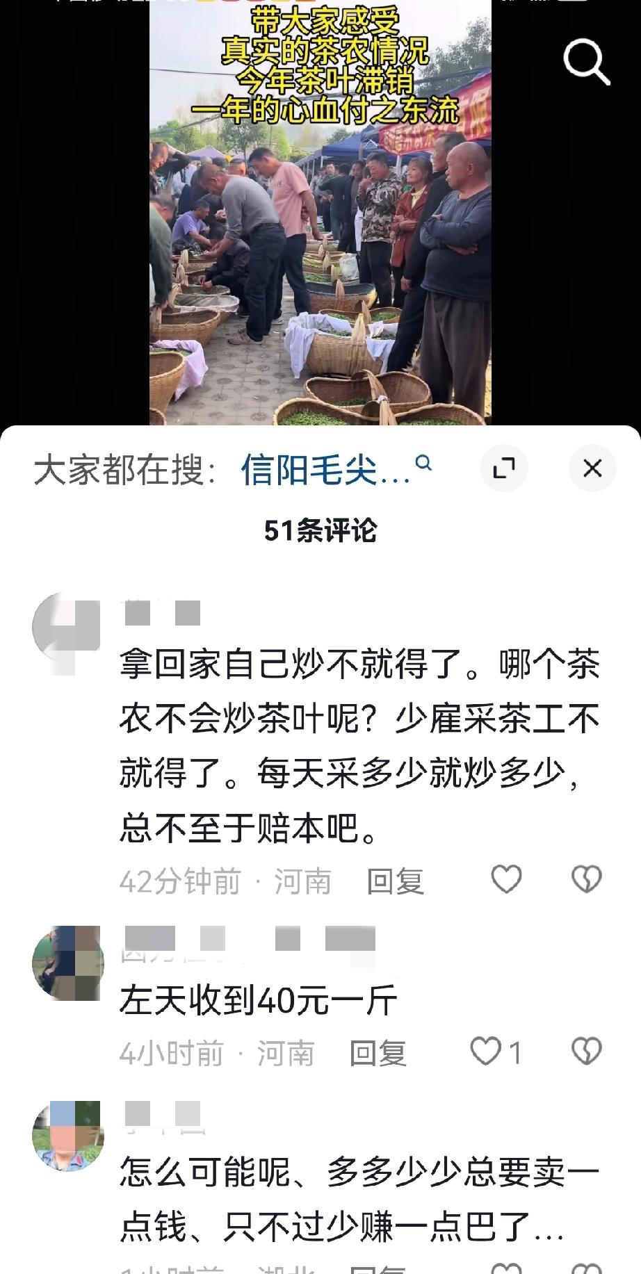 信阳茶农突然发现,今年的茶叶丰收了,质量也提高了,但却突然不好卖了。往年这个时候,一斤好芽可以卖二三百,最不济也卖一百多,可今年卖不掉,最底有的降到40,从外面请来采茶的也只好提前打道回府。究其原因,今年天气好,雨水足,阳光也充足,茶树长势旺,产量比往年大幅提高,二是前几年因为信阳毛尖畅销,种茶树赚钱多,农村补种的树苗多,今年产量大爆发,物以稀为贵,反之则贱,三是往年炒作的茶叶价格虚高,今年突然回归自然,心理落差大,感觉价格降了,四是市民的消费观和消费心理回归理性,不再认为喝高价茶才有牌面,五是国家反腐取得成效,往年价格几千,一般都是送礼的,真正自己喝的都是几百的,送礼的少了,买的也就少了,六是前两年生产茶啤酒用量大,现在茶啤酒热下去了,消耗的茶叶也少了。大家说说还有什么原因造成今年的茶叶突然不好卖了?