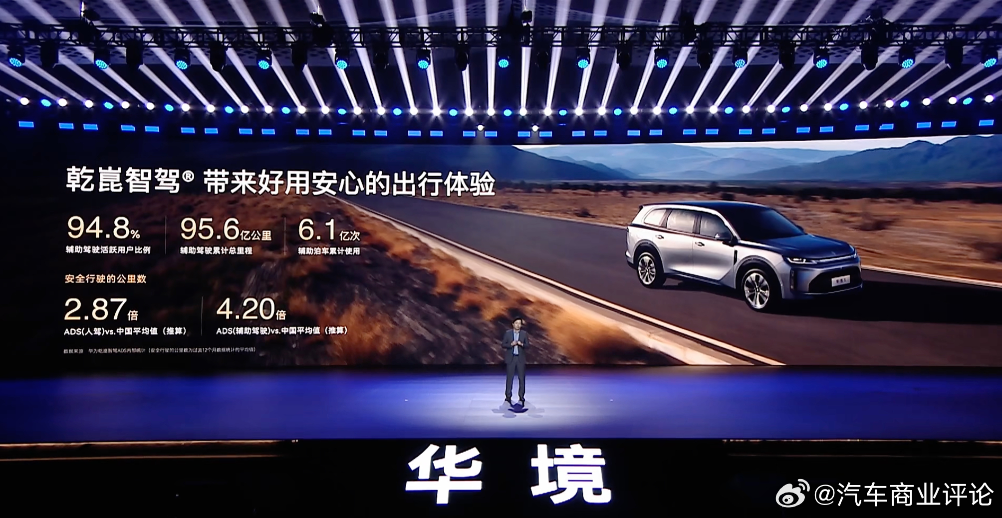 4月7日晚举行的华境S领航科技品鉴会上,华为乾崑公布最新出行报告。报告显示,截止2026年3月31日,华为乾崑智驾累计辅助驾驶里程达95.6亿公里,活跃用户占比94.8%,辅助泊车累计使用6.1亿次。ADS人驾模式下,每发生一次严重碰撞前的安全行驶里程,是中国人驾安全里程平均值的2.87倍;辅助驾驶模式下,更是达到4.2倍。华为乾崑用公开数据证明,乾崑智驾是真正好用、用户爱用的辅助驾驶。华境S全系标配华为乾崑华境S全维安全王中王4月7日华境S全球首发华为乾崑大六座华境S开启预订