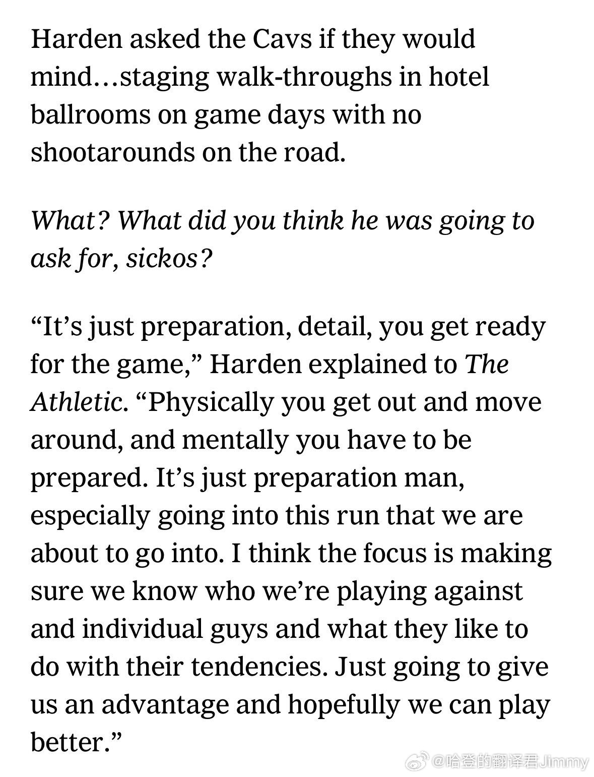 在哈登看来,备战从来不只是上场前活动一下身体那么简单,而是身体和心理都要提前进入比赛状态,明确对手是谁、每个人的习惯是什么、比赛该怎么打。这种对细节的执着,也正体现了他来到骑士之后展现出的领导力和职业态度