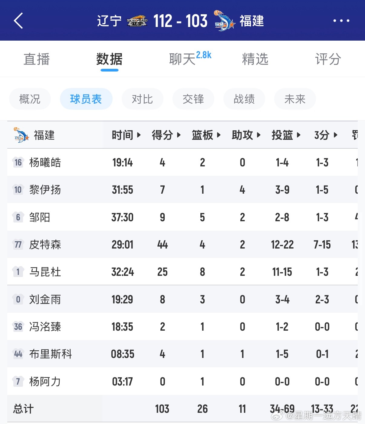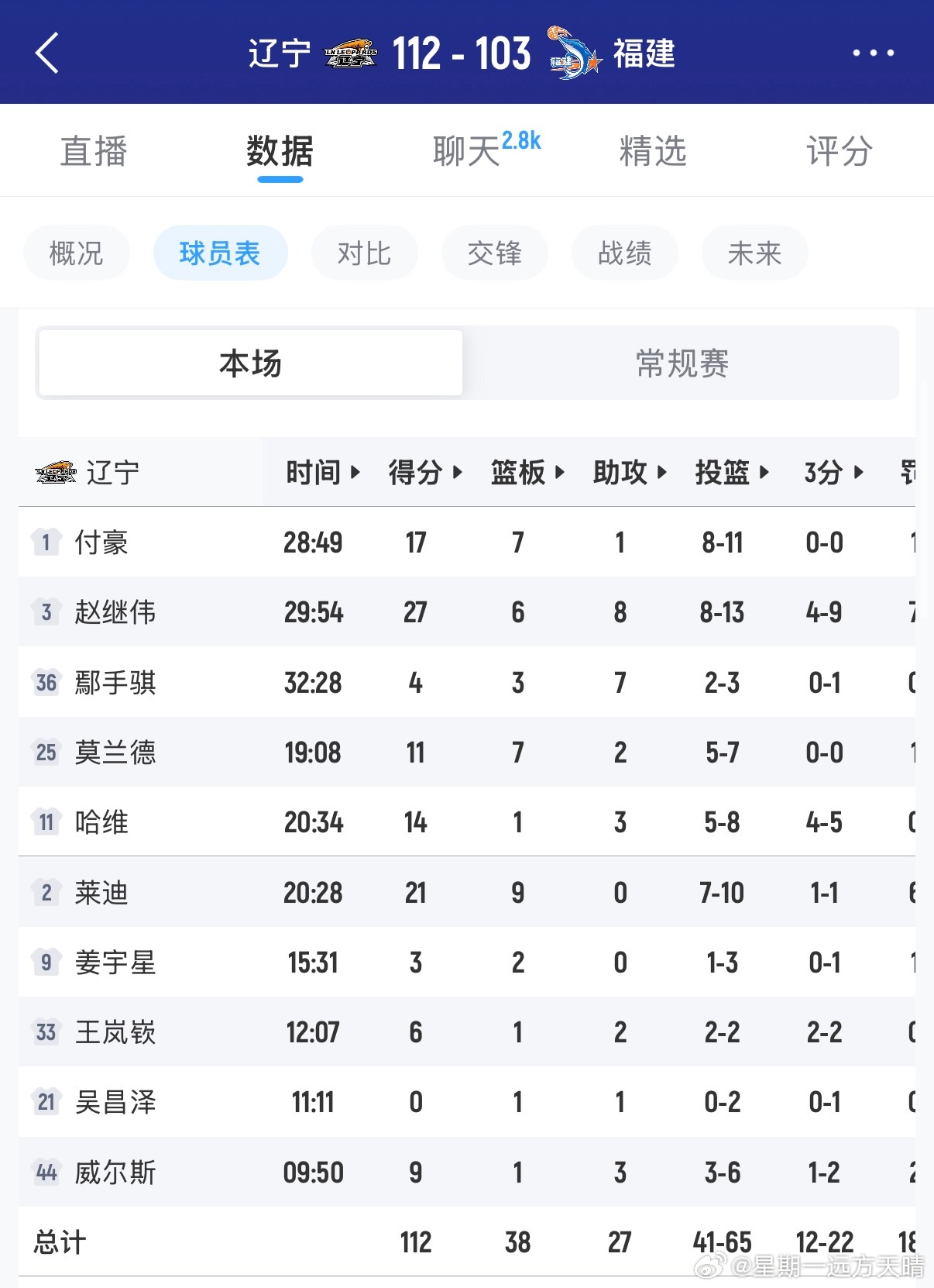 辽宁男篮VS福建男篮比赛结束,辽宁112:103福建获得胜利。今天辽篮非常高效,