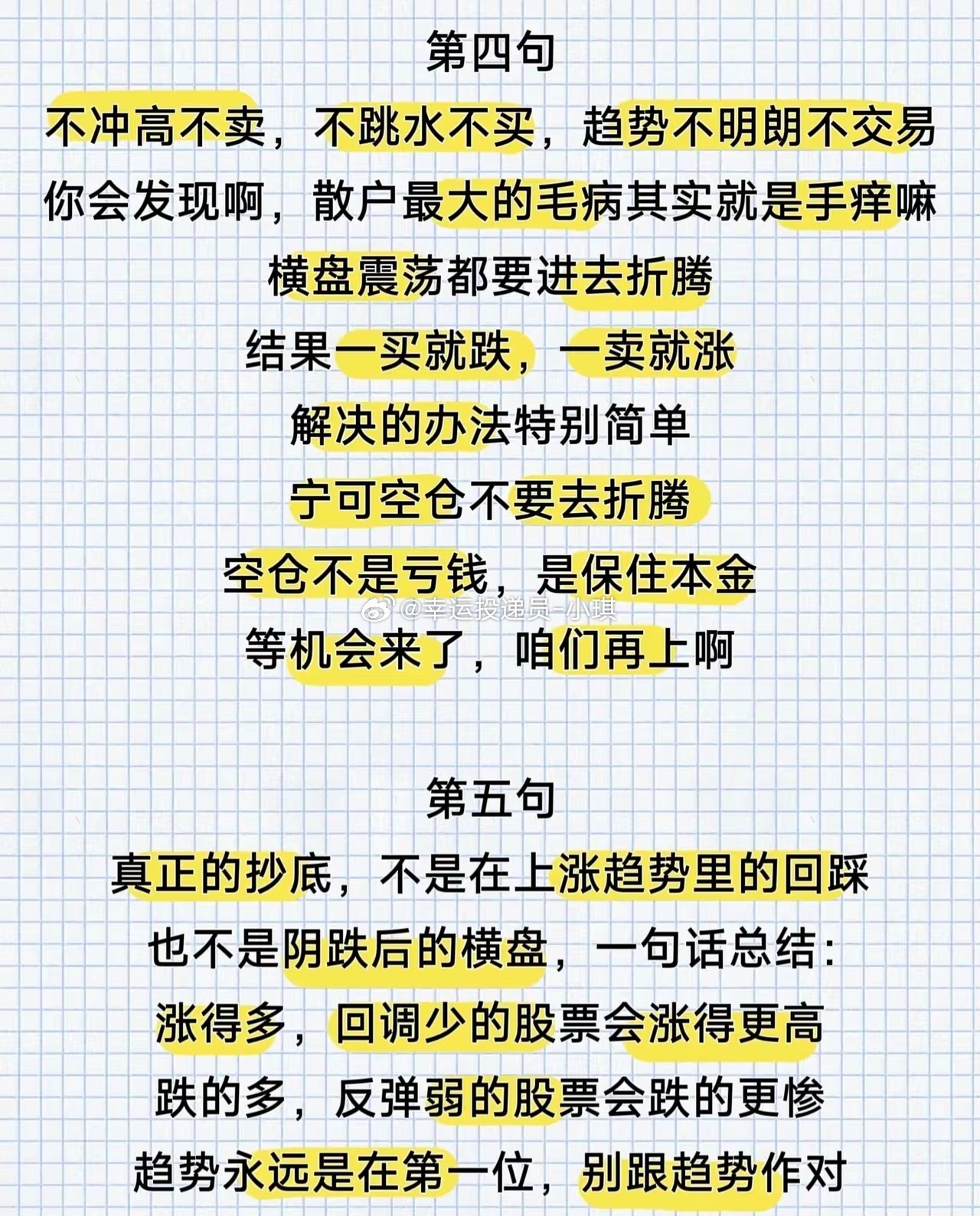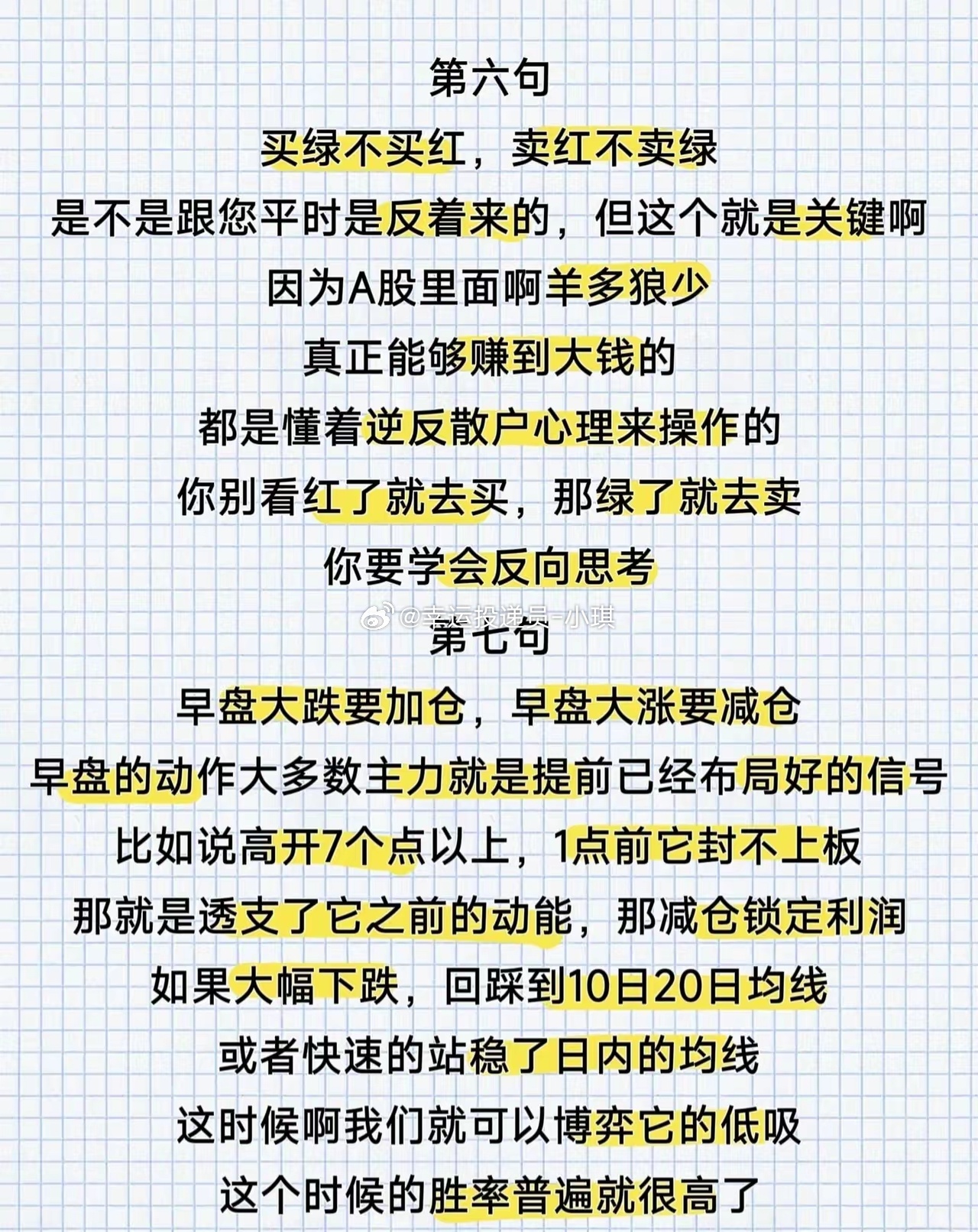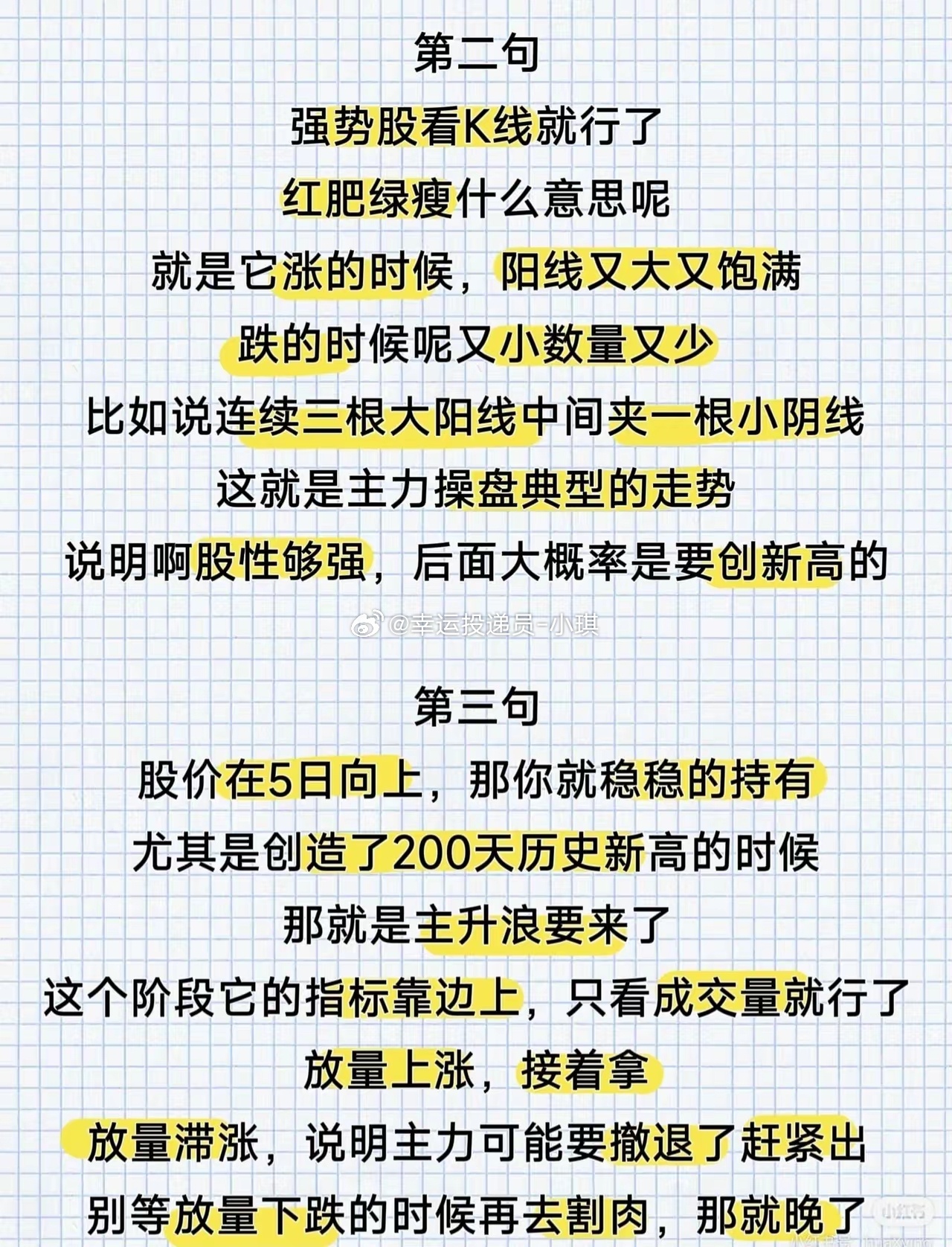 【炒股亏损时,记住这八句话】第一句:选股看“涨停基因”,远离“僵尸股”只选择20日内曾出现过涨停的股票。为何?每一个涨停的背后,都是真金白银的资金推动。散户资金分散,根本封不住涨停板——这类股票要么延续上涨趋势,要么整理后继续拉升。反观那些长期横盘阴跌、毫无起色的股票,本质是主力抛弃的“垃圾股”。哪怕价格再低,也别碰。记住:A股“牛短熊长”,牛市亏钱不可怕,可怕的是浪费时间。你的时间不该耗费在垃圾股上。第二句:强势股看K线,“红肥绿瘦”藏主升浪做强势股,盯K线就够了。“红肥绿瘦”是指:上涨时阳线又大又饱满(涨幅足、力度强),下跌时阴线又小又稀少(回调浅、抛压轻)。比如“连续三根大阳线+中间夹一根小阴线”,这是典型的主力控盘走势,说明股性极强,后续大概率创新高。第三句:趋势为王,均线+成交量定去留股价在5日均线向上时,坚定持有(尤其是创200天历史新高时,主升浪即将开启)。这个阶段指标可暂时忽略,只看成交量:- 放量上涨→继续拿(资金推动,趋势延续);- 放量滞涨→赶紧出(主力或借机撤退,别等放量下跌再割肉,为时已晚)。第四句:交易纪律,“三不原则”避情绪陷阱不冲高不卖,不跳水不买,趋势不明朗不交易。散户最大的毛病是“手痒”,横盘震荡都想折腾,结果“一买就跌,一卖就涨”。解决之法:宁可空仓,不瞎折腾。空仓不是亏钱,是保住本金,等机会来了再重拳出击。第五句:抄底顺趋势,别跟“弱势惯性”作对真正的抄底,不是“上涨趋势里的回踩”,也不是“阴跌后的横盘”。总结:涨得多、回调少的股票,会涨得更高;跌得多、反弹弱的股票,会跌得更惨。趋势永远第一位,别逆势抄底。第六句:反向操作,“买绿卖红”赚大钱A股“羊多狼少”,真正赚大钱的人,都懂逆散户心理操作:别“红了就买、绿了就卖”,要学会反向思考——买绿不买红,卖红不卖绿。第七句:早盘信号定加减仓,博弈低吸高胜率早盘的走势,大多是主力提前布局的信号:- 早盘大涨(如高开7个点以上,1点前封不上板)→ 透支动能,减仓锁定利润;- 早盘大跌(回踩10/20日均线,或快速站稳日内均线)→ 博弈低吸,此时胜率很高。第八句:学会空仓,守住本金是底线空仓是炒股必备的能力,散户死穴是“永远满仓”,不懂休息。出现这三个信号,立刻空仓:1. 5日均线拐头向下(趋势转弱);2. K线跌在均线下方(支撑失效);3. 出现实体阴线、连板断板未修复(情绪退潮)。守住本金比什么都重要!行情差时别烦躁,炒股炒的是心态,不是技术。别人恐慌我贪婪,才能不被主力牵着鼻子走。(注:策略仅为经验分享,股市风险复杂,需结合自身情况理性判断,不构成投资建议。)