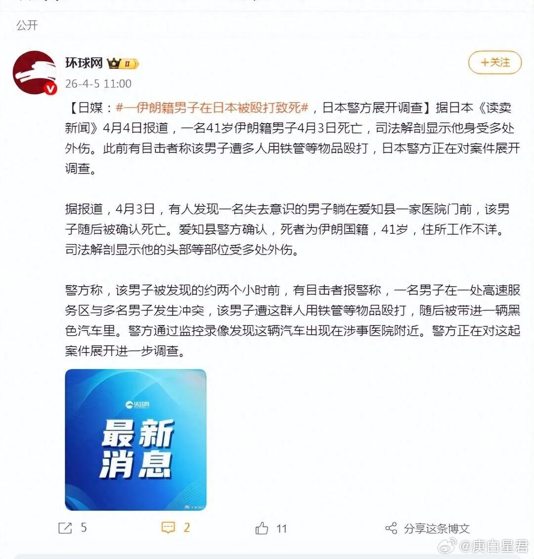 死者名叫沙赫莫拉迪,41岁,伊朗籍,身上多处外伤,头部被重击,全身皮下出血。据日本《读卖新闻》和环球网多家媒体4月5日报道,目击者称,大约两小时前,此人在一处高速服务区与多名男子发生冲突,被这群人用铁管等物品围殴,打得血肉模糊。打完以后,这帮人还把他塞进一辆黑色汽车带走,像扔垃圾一样丢在医院门口。