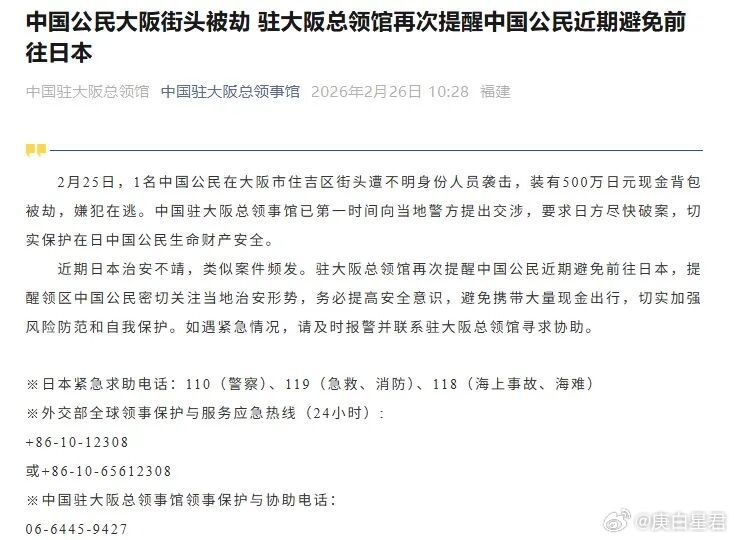 中国驻大阪总领馆随后发出通告,要求日方尽快破案,甚至直接建议中国公民近期避免前往日本。注意这个措辞,总领馆很少对国民发出“避免前往”的预警,这等于是在告诉全体中国人: