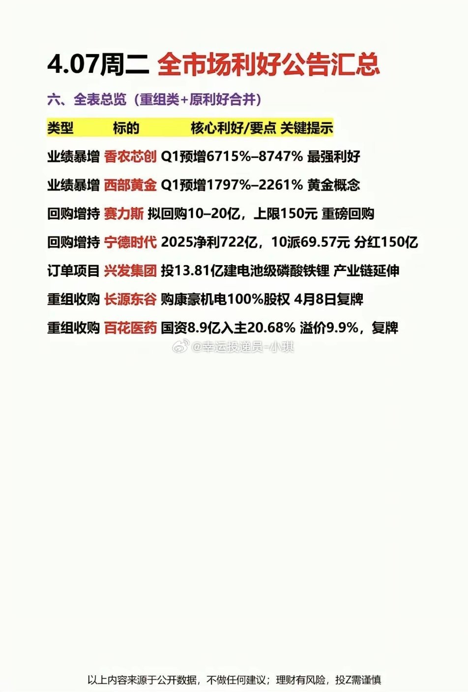 4.7周二 晚间 利好公告消息汇总!1.业绩暴增股2.回购、增持、分红3.重大订单、收购、项目4.补助,一季报预增等