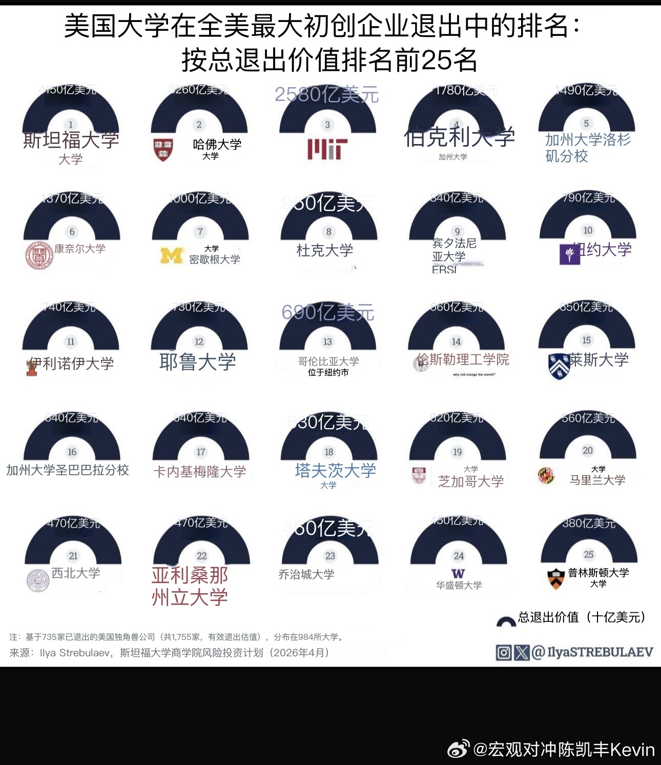 美国创业企业家来自的大学排名,前25个,基本上就是最好的25个大学了 美国凯丰基本面纽约斯坦福大学哈佛大学纽约大学普林斯顿大学宾大