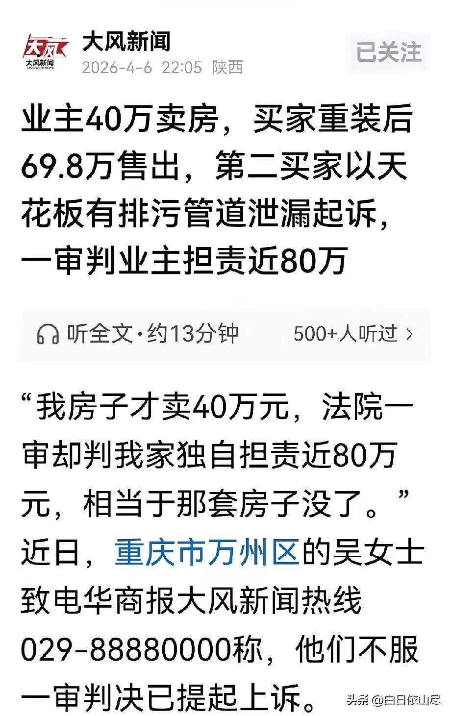 重庆万州,女子因搬家以40万的价格,卖掉了154平的学区房,买家装修后,以69.8万卖给了另一买家。万万没想到,过户7个月后,女子和第一买家,双双被第二个买主告上法庭,称房子的刻意隐瞒重要事实,使她受到欺诈,要求赔偿损失。岂料,法院一审排除第一买主,要求女子独自返还69.8万元购房款,和其他费用,总共大约80万元。女子不服! 事情要从女子决定卖房的初衷说起,这位女子在万州拥有一套154平方米的学区房,房子地处万州核心地段,周边配套成熟,对口的学校资源优质,一直是市面上比较抢手的学区房户型。 因为自身工作调动加上家庭搬家规划,女子不再需要这套房产,便打算将其出售变现,换置更适合当下生活的住所,从一开始,她卖房的想法就十分纯粹,没有任何投机或隐瞒的心思。 这套房子建成已有一定年限,此前女子并未自住,而是长期对外出租,先后有租客用来经营小型商铺和住宿类生意,房屋整体结构没有问题,但内部存在一些老旧设施的使用痕迹。 女子在决定卖房后,按照正常流程梳理房屋产权,确认产权清晰无纠纷、无抵押查封等问题后,便通过当地房产交易的常规渠道,发布了卖房信息,报价也贴合当时的市场行情,没有虚高定价,一心想尽快完成交易,不耽误搬家事宜。 没过多久,第一位买家就看中了这套房子,双方经过多次沟通看房,对房屋面积、位置、学区属性等核心信息都达成了一致,最终敲定了40万元的成交价格。 这个价格在当时的万州学区房市场中属于合理区间,女子也没有刻意压价或抬价,双方本着自愿的原则,签订了初步的房屋买卖协议,第一位买家按照约定,陆续向女子支付了全部40万购房款,女子也将房屋的钥匙交付给对方,完成了房屋的交接手续。 值得注意的是,当时双方并未立刻办理房屋过户手续,而是约定了后续配合过户的时间,第一位买家拿到房子后,没有选择自住,而是立刻着手对房屋进行全面装修。 原本的老旧装修被全部拆除,墙面、地面、吊顶都重新翻新,屋内的水电线路也做了部分调整,原本暴露在外的一些管道,被装修后的吊顶和装饰包裹起来,经过一番装修,房屋外观看起来焕然一新,原本的老旧痕迹被彻底掩盖,整体品相提升了不少。 第一位买家装修完成后,并没有长期持有,而是迅速将房子挂到市场上二次出售,报价直接定为69.8万元,相比从女子手中买入的价格,高出了29.8万元。因为装修后房屋看起来崭新,加上学区房的优势,很快就吸引了第二位买家的注意,第二位买家一心想购置一套学区房方便孩子上学,看到这套房装修精致、位置合适,没有过多犹豫,就决定购买。 由于房屋还未完成第一次过户,产权依旧在原房主女子名下,第二位买家购房时,需要女子配合直接办理过户手续。女子本着配合交易的想法,按照第一位买家的要求,出具了相关产权证明,委托相关人员协助办理过户流程,全程没有参与两位买家之间的交易议价,也不清楚第一位买家转卖的具体价格,只是配合完成产权过户的必要流程,很快,房屋就顺利过户到第二位买家名下,所有交易流程看似圆满完成。 第二位买家拿到过户后的房产,满心欢喜准备入住,可在装修收尾和细致查验房屋的过程中,逐渐发现了房屋存在的隐蔽问题。她发现房屋餐客厅的天花板内部,藏有整栋楼的共用排污管道,管道存在明显的渗漏痕迹,周边墙面和吊顶内侧有受潮、发霉的迹象,平日里还会散发出异味,严重影响居住体验。更关键的是,这些问题都被前一位买家的装修刻意掩盖,不拆开吊顶根本无法发现。 在发现这一重大房屋瑕疵后,第二位买家认为自己在购房过程中受到了欺诈,原房主女子和第一位买家,都刻意隐瞒了房屋排污管道渗漏的关键事实,导致她在不知情的情况下,以69.8万的高价购买了存在严重问题的房子,遭受了经济损失。越想越气愤的她,在房屋过户7个月后,整理好相关证据,将女子和第一位买家一同告上了当地法院,要求撤销房屋买卖合同,并且赔偿自己的全部损失。 一审判决要求女子独自返还第二位买家69.8万元购房款,除此之外,还要承担第二位买家购房过程中产生的过户税费、中介费用、资金占用利息以及其他相关合理开支,几项费用加起来,总赔偿金额达到了大约80万元。这个判决结果出来后,女子当场表示无法接受,她坦言自己当初卖房只拿到了40万房款,如今却要赔偿近80万,差价巨大,自己完全没有能力承担,当即表示不服一审判决,准备提起上诉,维护自己的权益。 对此,你们有什么看法,欢迎评论留言~