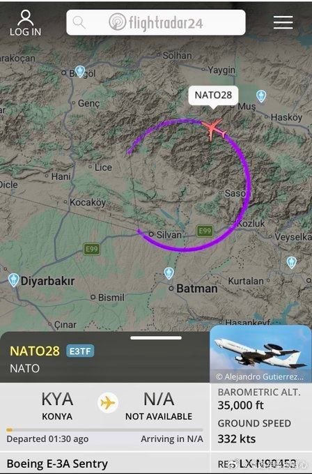 一架美国预警机(AWACS)从土耳其科尼亚空军基地起飞,在穆什(Muş)与巴特曼(Batman)两市之间的空域已连续巡航超过两小时。