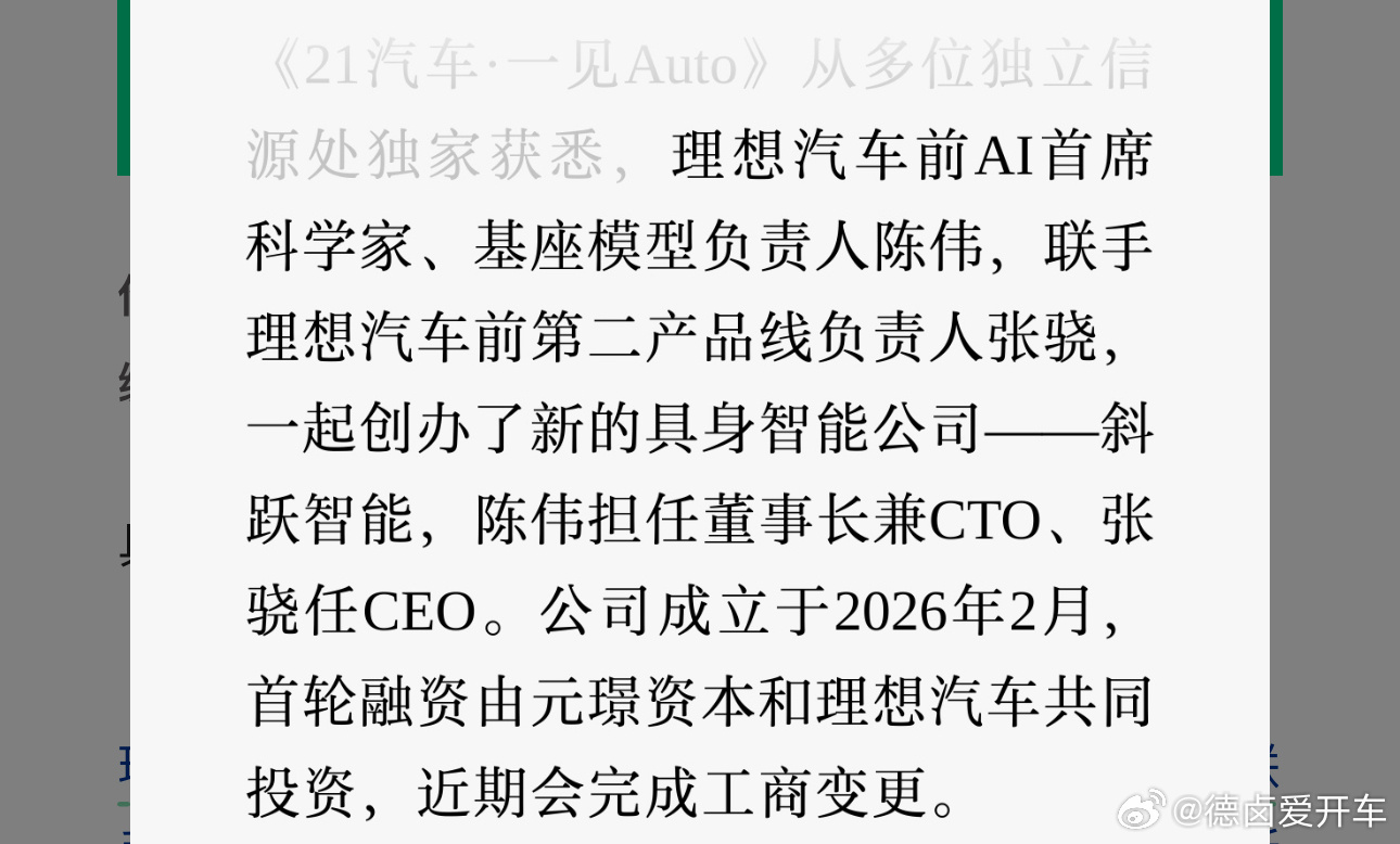 前理想AI首席科学家、基模负责人「陈伟」与前第二产品线负责人「张骁」一同创办具身智能公司「斜跃智能」,