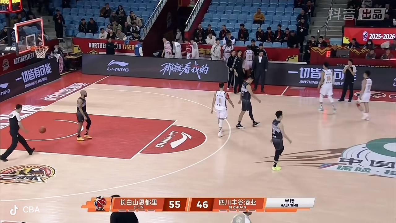 在刚刚结束的吉林长白山恩都里主场迎战四川丰谷酒呀男篮的上半场比赛 ,吉林队暂时以55比46领先。