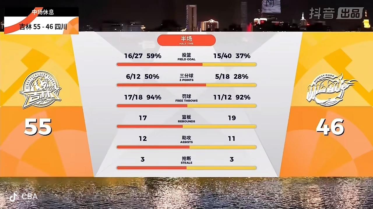 纵观上半场比赛 ,吉林队摩尔、威儿逊、姜伟泽得分上双,但是,姜伟泽被罚出场。反观四川队,景函一、李玮竟得分上双 表现出色。