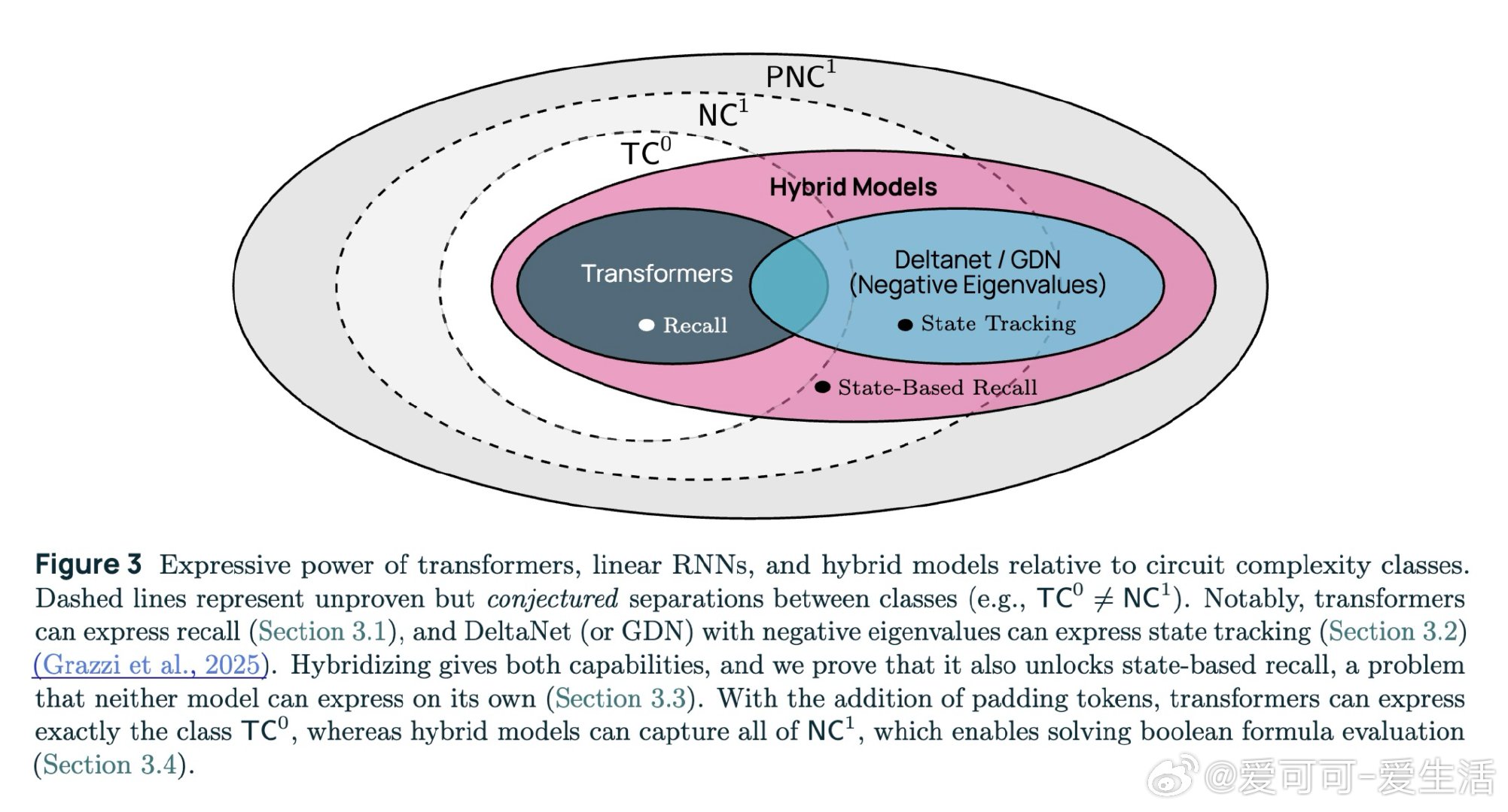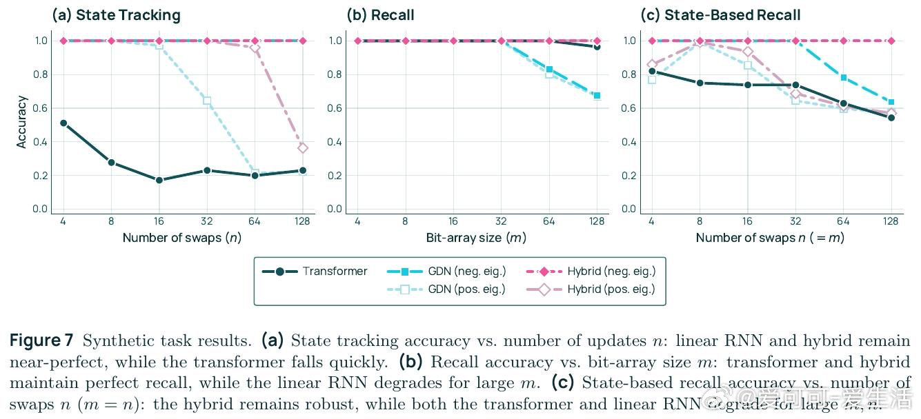本文的核心洞见是:把混合架构重新看作一种超越两者之和的新计算范式。GDN层用负特征值实现状态追踪,注意力层实现精确召回,二者交替叠放后能解决"状态依赖召回"——即先追踪指针状态、再用该指针索引数组——这一任务既不可由纯Transformer表达,也不可由纯GDN表达。由此,将25%注意力层与75% GDN层交错排列这一关键操作,使7B模型用少49%的训练token便追上同规模纯Transformer,并在所有基准上全面领先。