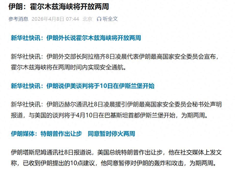 第三,霍尔木兹海峡是伊朗手里最大的一张牌。现在伊朗同意开放两周。两周之后呢?如果谈崩了,伊朗能说关就关吗?到那时国际舆论会说——是你伊朗先开放的,现在又关,是你破坏和平。美国正好把责任全推给伊朗。