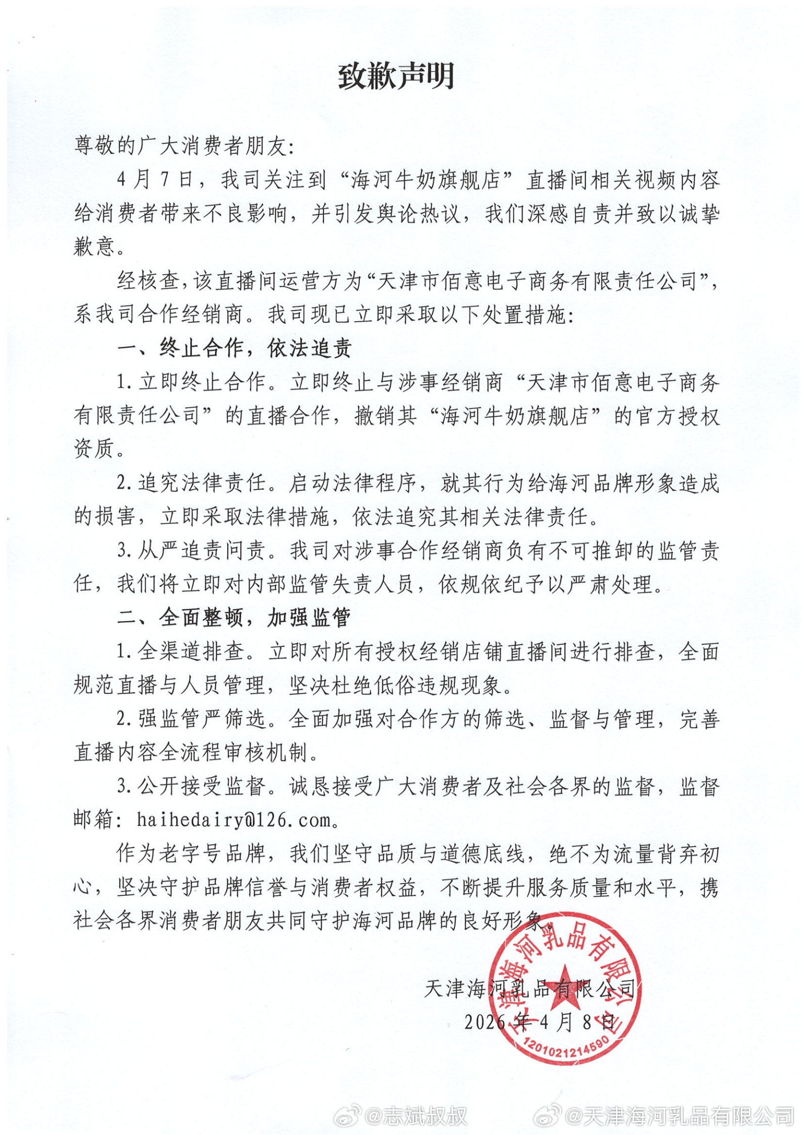 海河乳品致歉老品牌,不是老流氓发生这种事情是该好好认错和整改。这也证明了直播多多