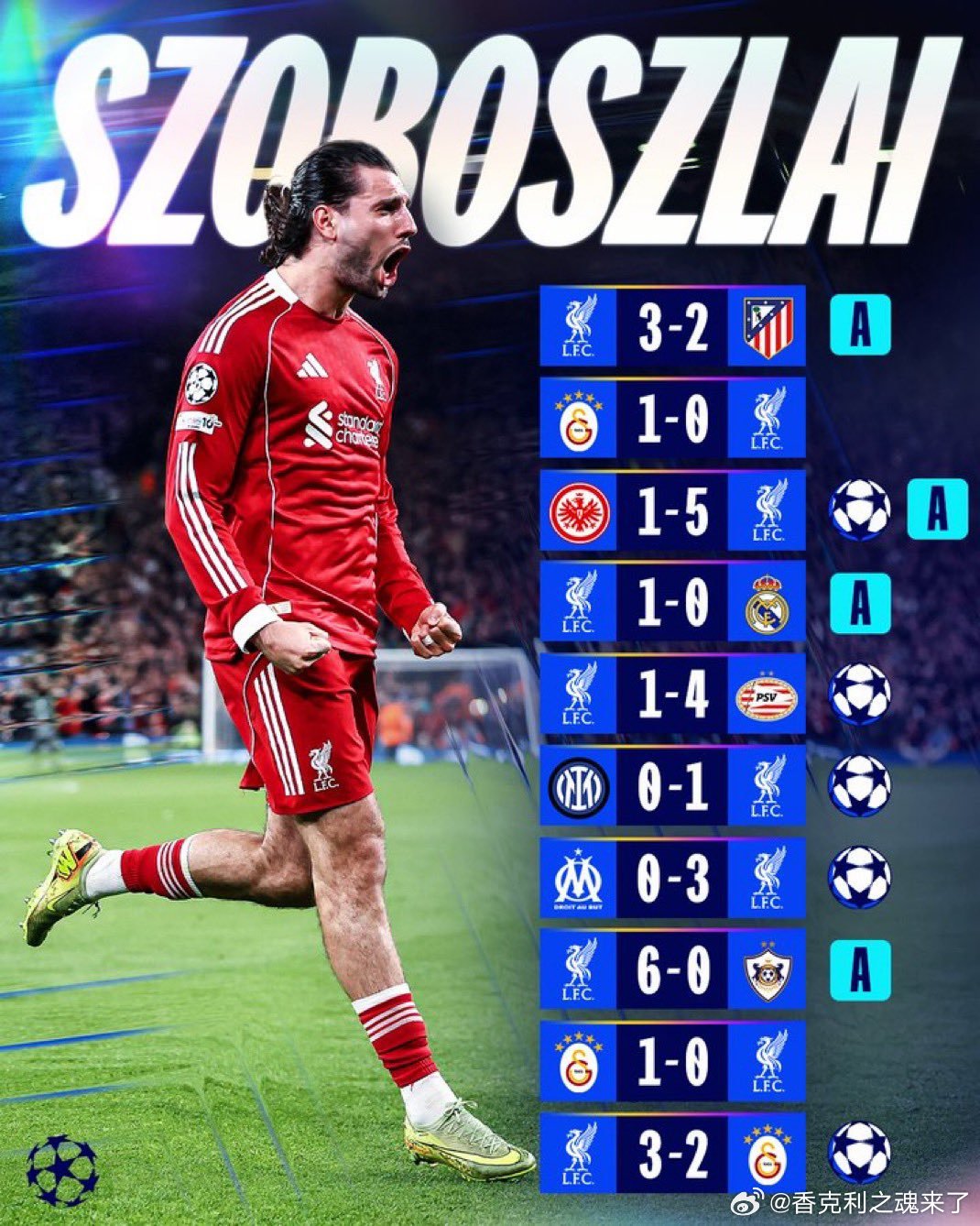 本赛季利物浦欧冠关键之人!索博 5球4助攻!出场时间:885分钟(场均约88.