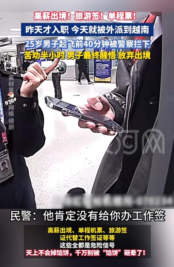 太吓人了!近日,上海,一男子入职第二天,就被外派去越南工作,公司只为他办理了旅游签证和单程机票,但男子没有怀疑,收拾行李后准备前往,他表哥觉得不对劲,连忙报警,警方在男子登机前40分钟紧急拦下!网友:找工作要当心!