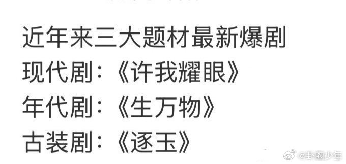 网友评这两年的三大题材爆剧网友评三大题材爆剧网友盘点近两年三大题材爆剧,现代剧《许我耀眼》、年代剧《生万物》、古装剧《逐玉》上榜,引发不少观众讨论。