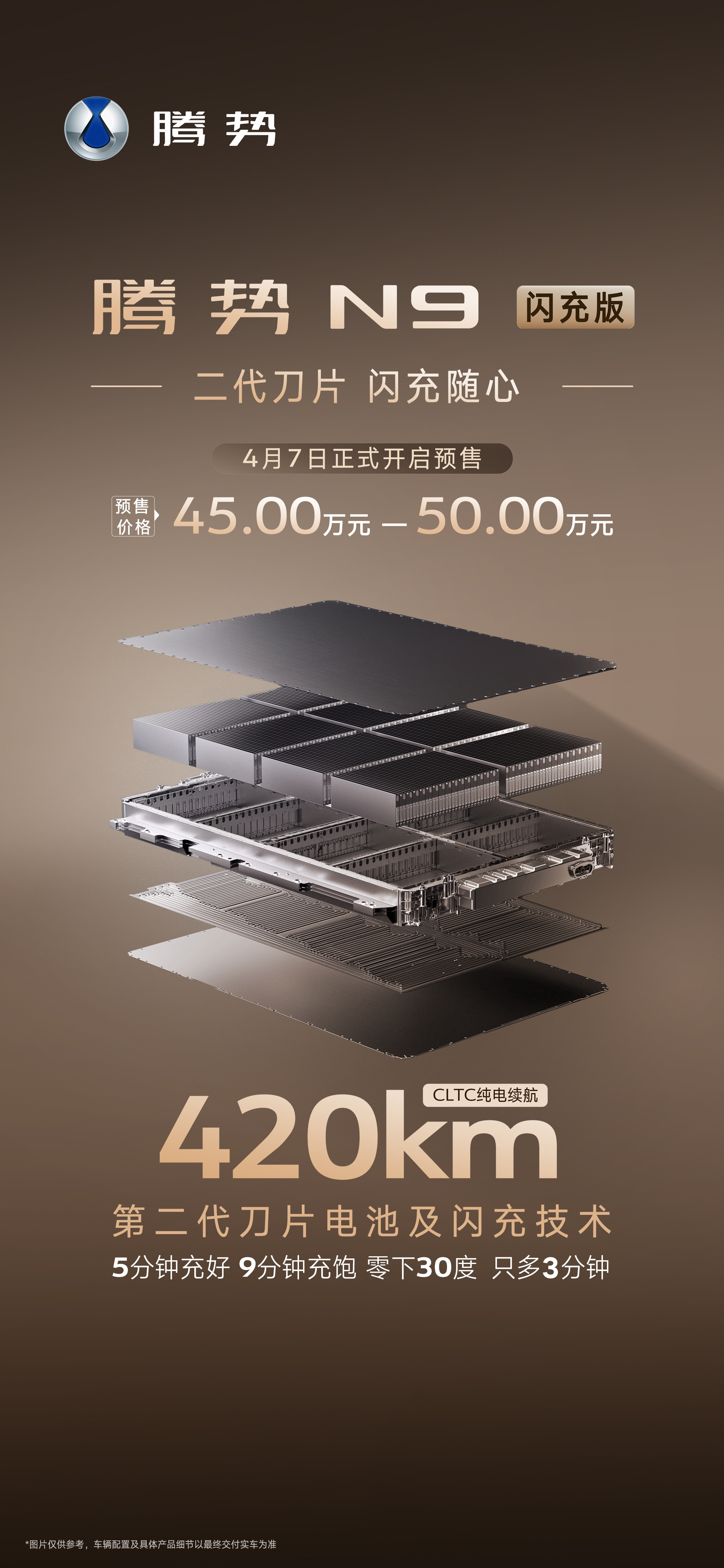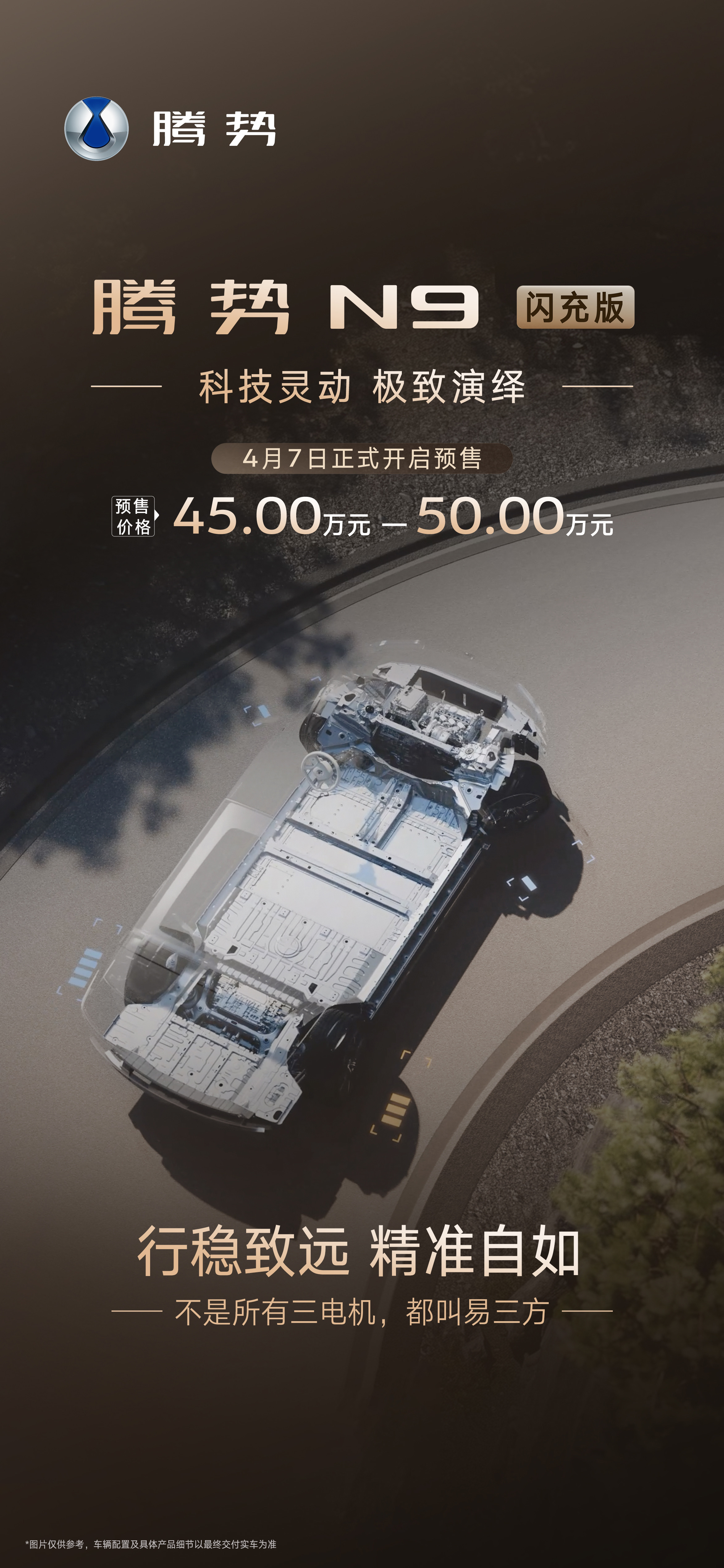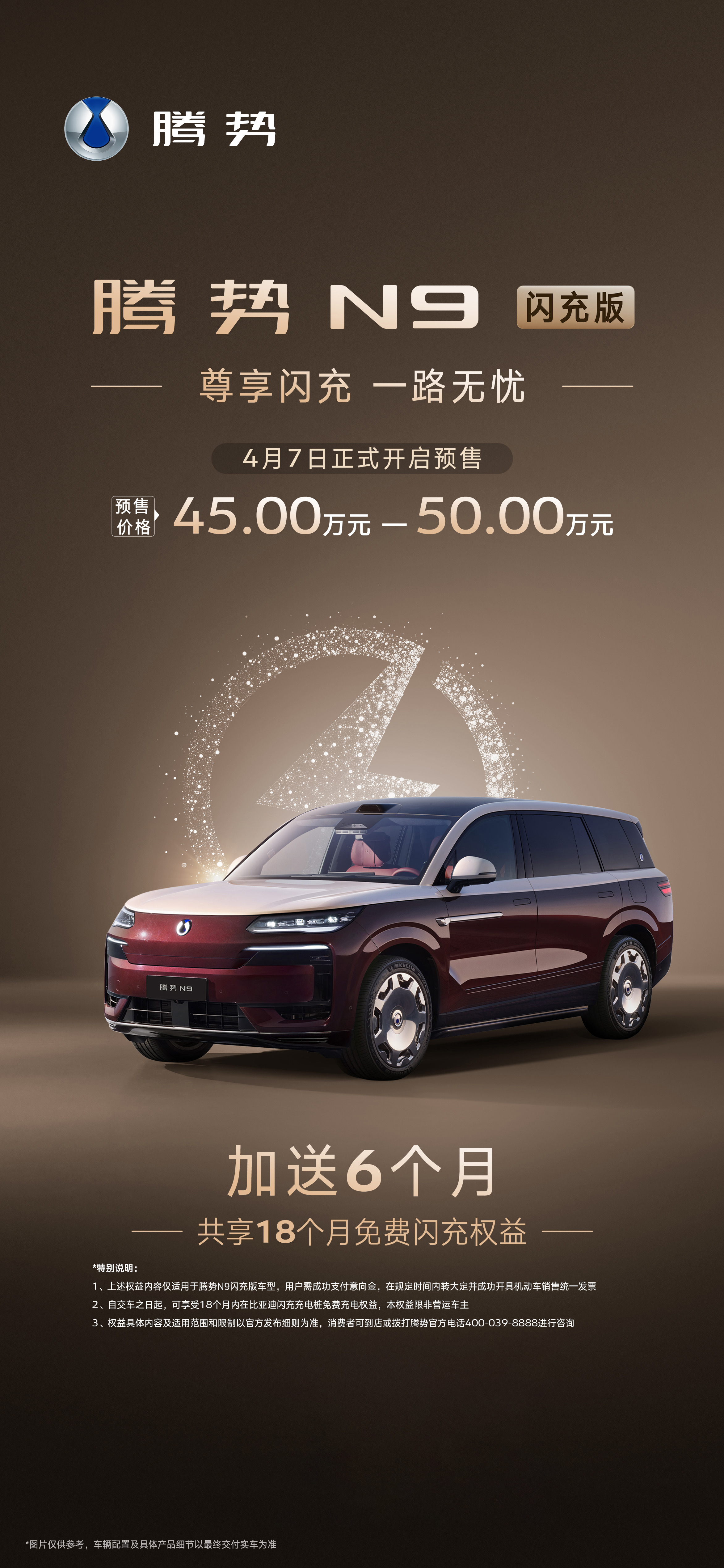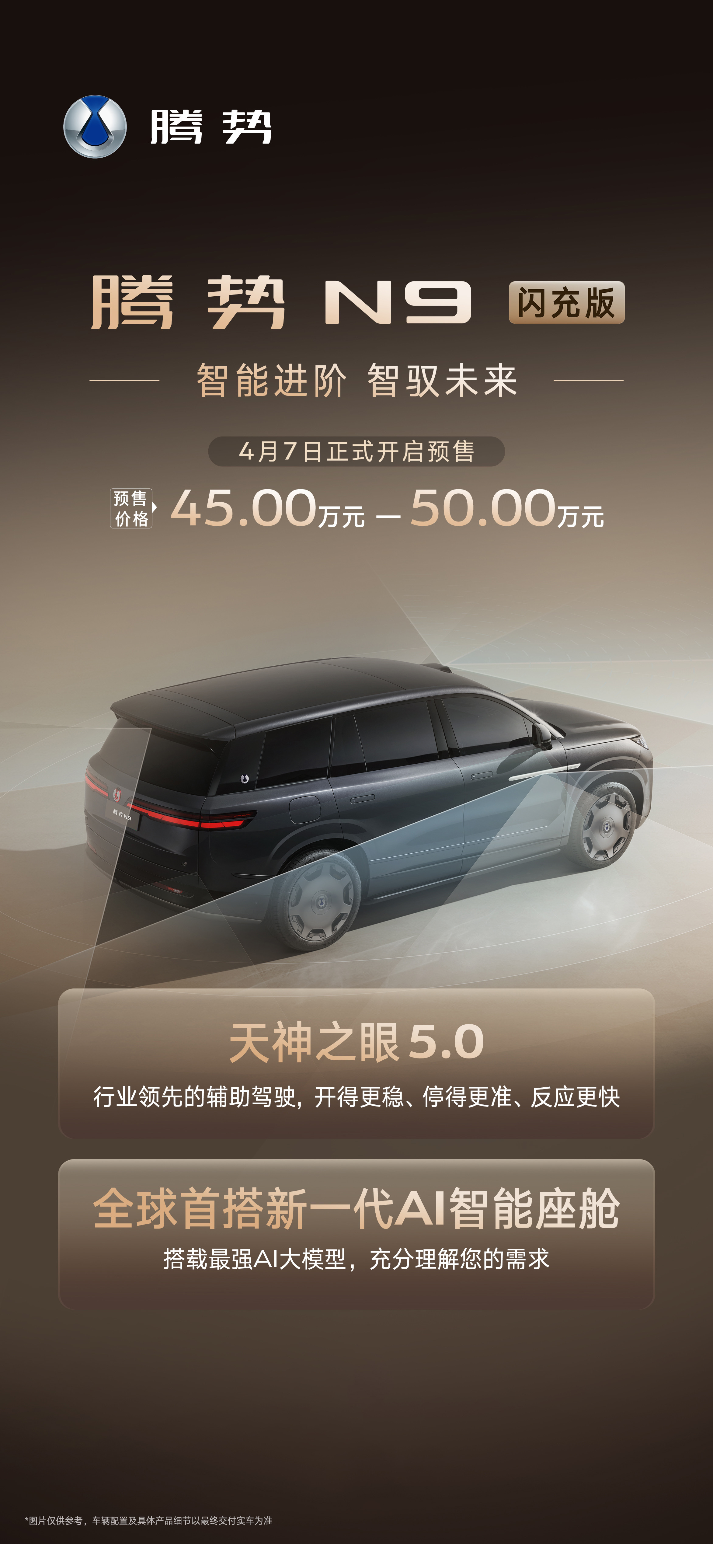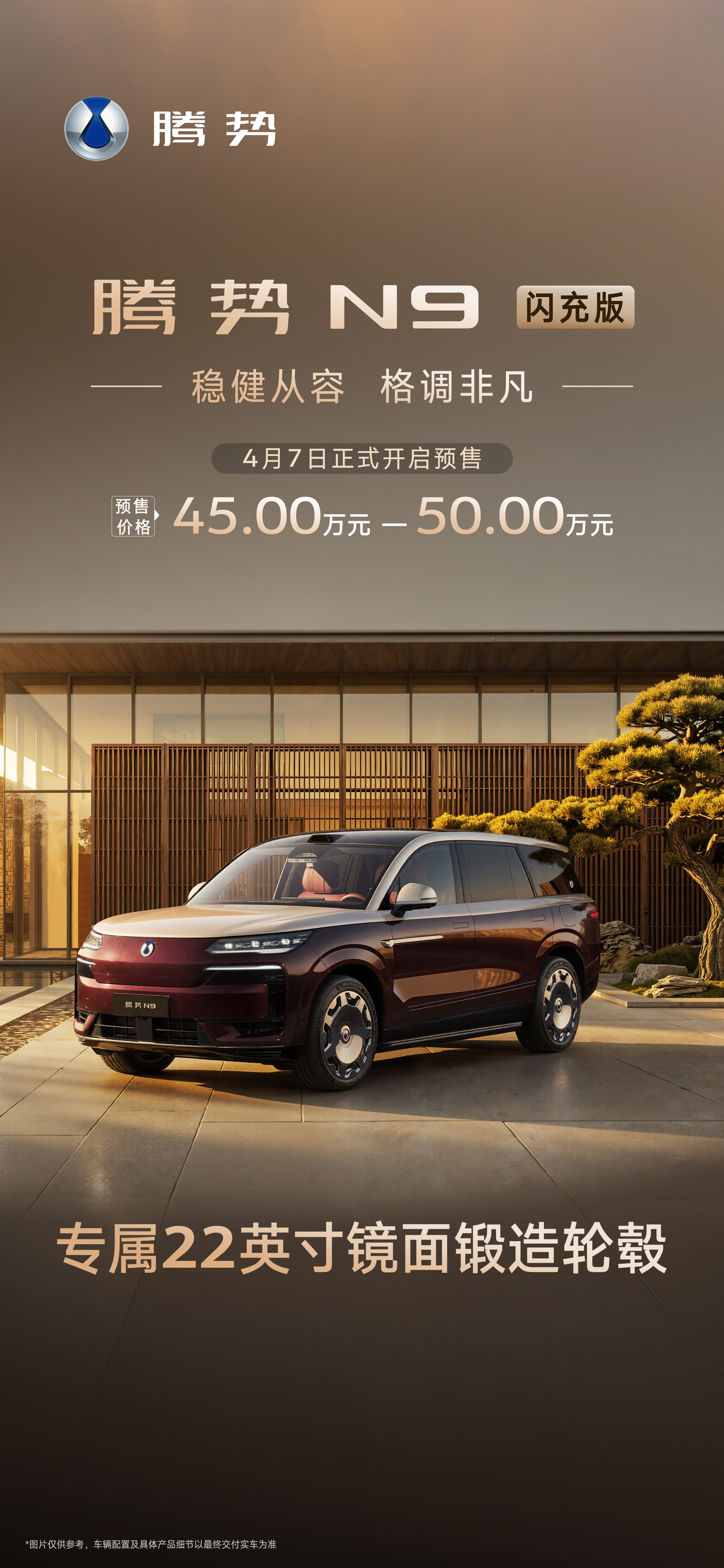 腾势 N9 闪充版一眼倾心!预售 45-50 万,还送 18 个月免费闪充,诚意很足。续航 420km,闪充速度超快,冬天也不打折。22 寸轮毂气场强,内饰质感高级,智能驾驶好用,安全性能拉满,开出去很有排面。腾势 N9 闪充版腾势 N9 闪充版纯电续航突破 420km腾势 N9 闪充版预售价 45 万 - 50 万元