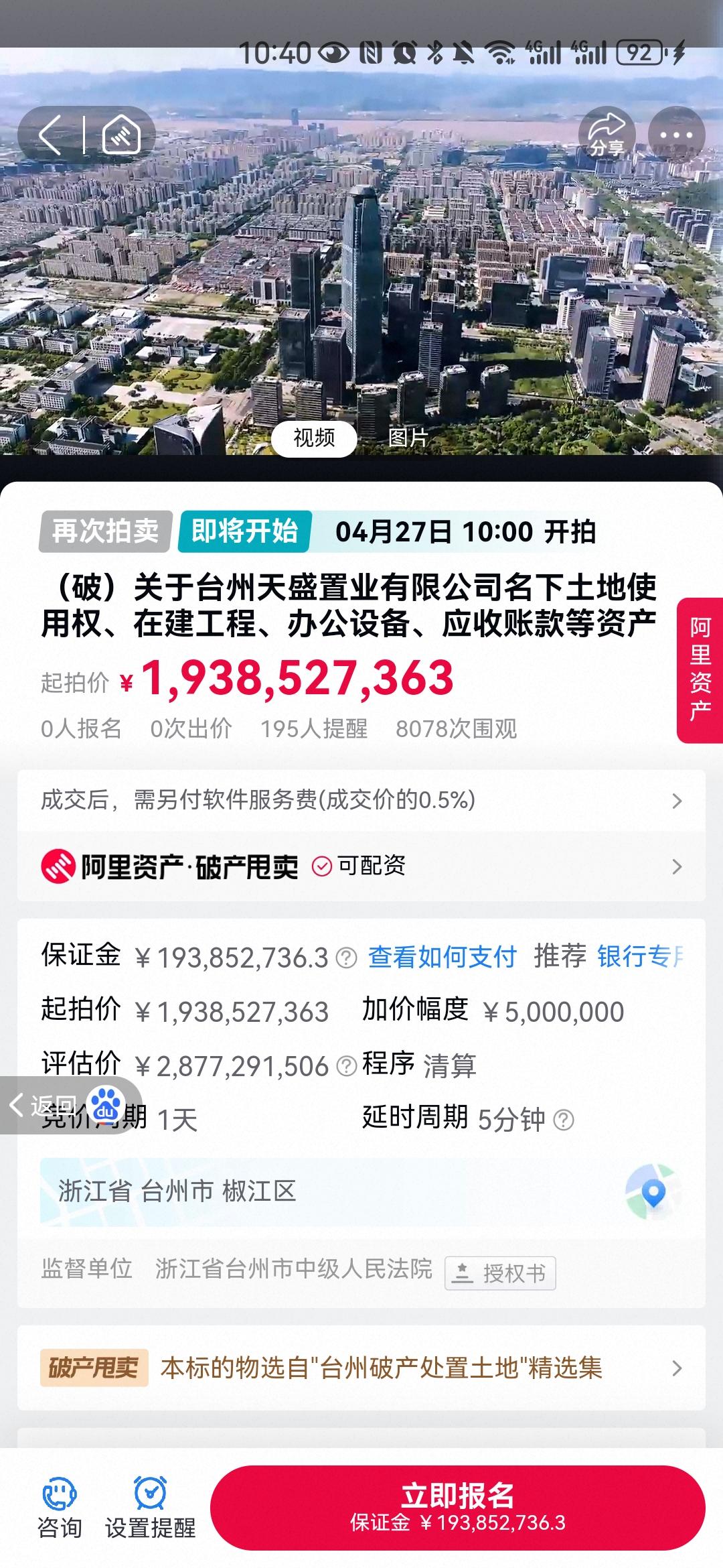 天盛中心第一次起拍价28.58亿元,第二次起拍价23.55亿元,第三次起拍价19.38亿元。