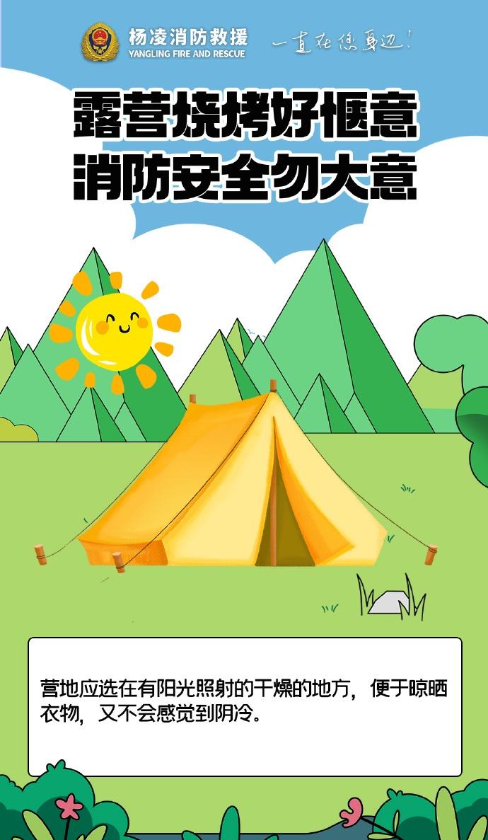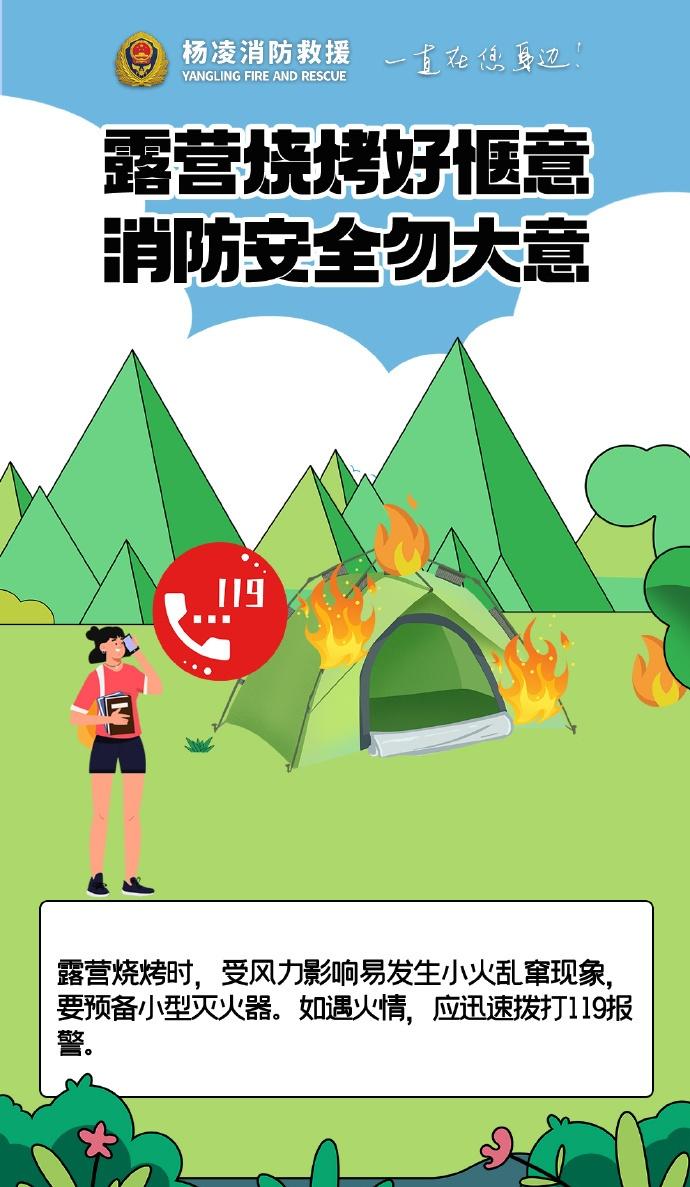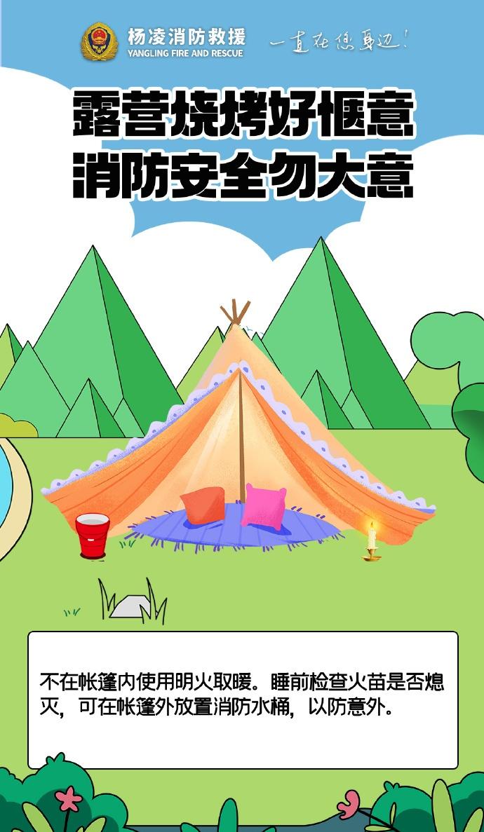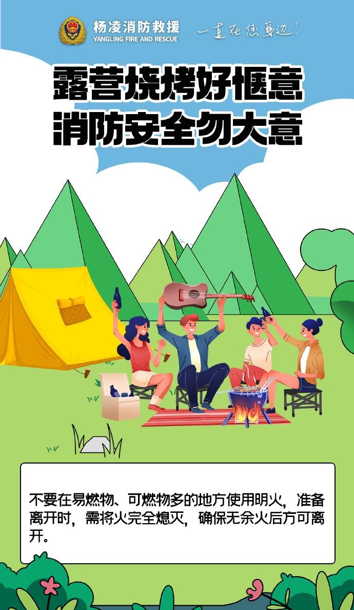 】露营烧烤别大意,选好远离草木的安全区域,备好灭火器材,人走火灭彻底熄,严防明火引火灾,平安露营更安心。陕蓝消防云科普 (杨凌消防)