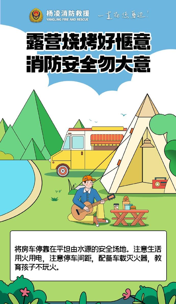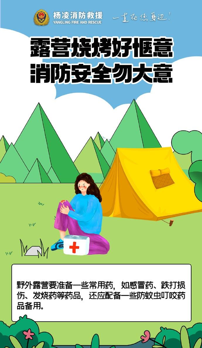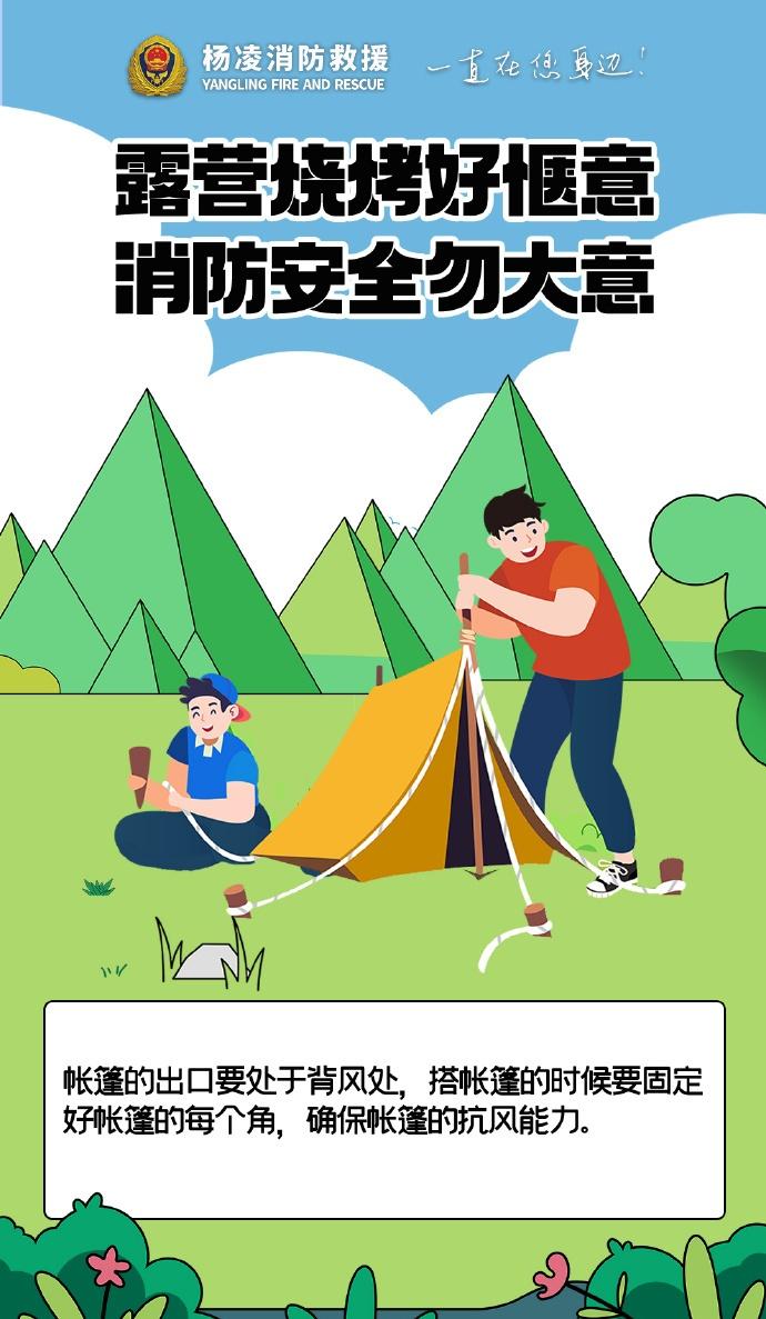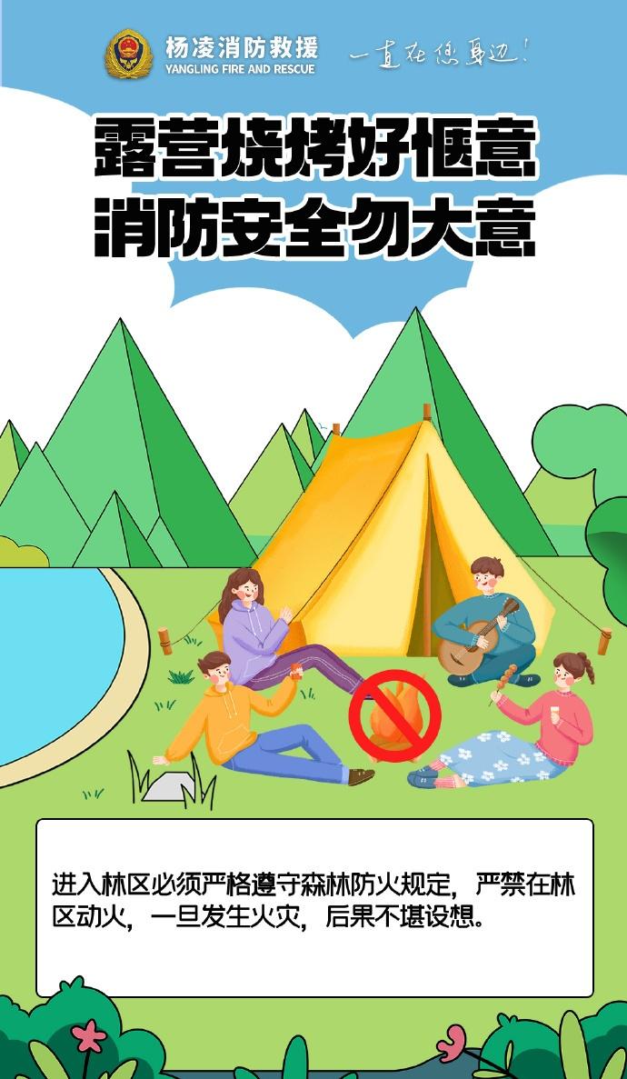 】露营烧烤别大意,选好远离草木的安全区域,备好灭火器材,人走火灭彻底熄,严防明火引火灾,平安露营更安心。陕蓝消防云科普 (杨凌消防)