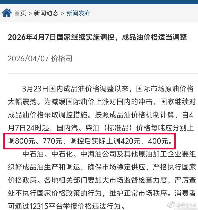 又喜大普奔了,文字这一块确实是厉害。原本1升油要涨6毛,现在只需要涨3毛,加50升少花15元的样子。真是苦了咱们的油车用户了,一半都是税,油桶比油贵,小涨3毛大降3分,啥都不说了。不知道这次油价起飞又要让多少人换电车啊?但是话说回来,羊毛出在羊身上,开电车的成本也会越来越高的,早晚都要挨一刀的事儿…..国家继续出手调控油价4月7日24时油价迎来上调继续对成品油价格采取调控措施油价