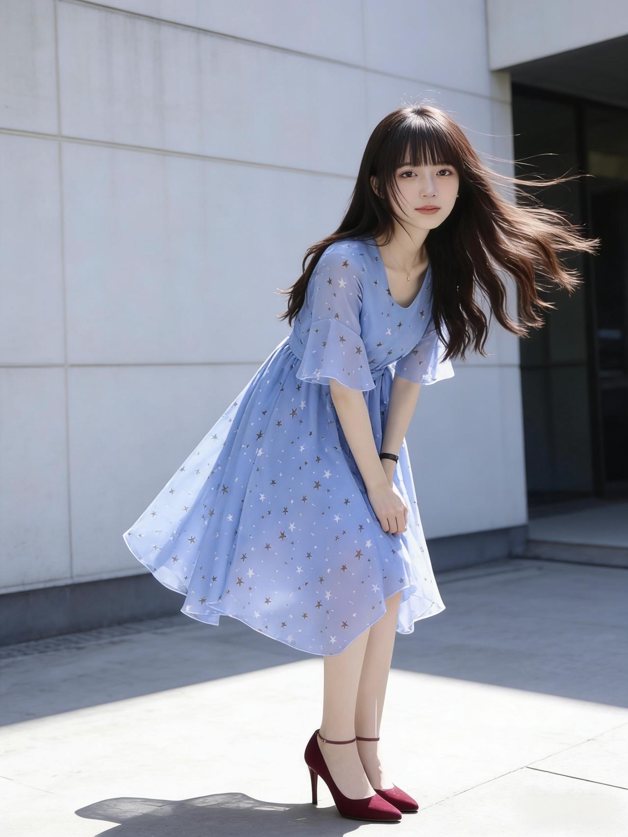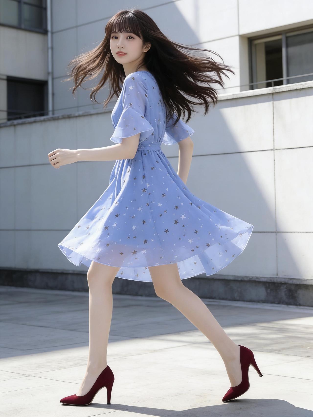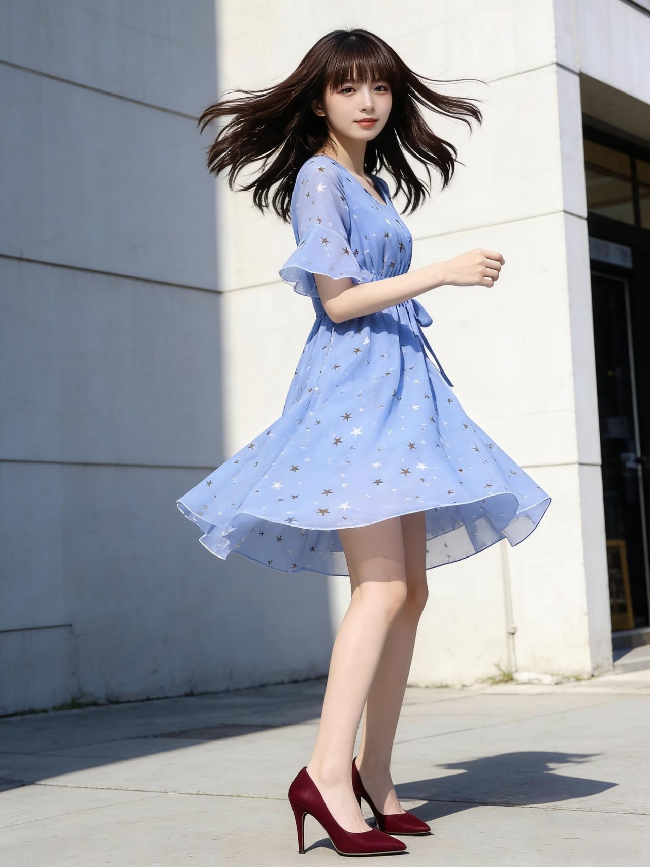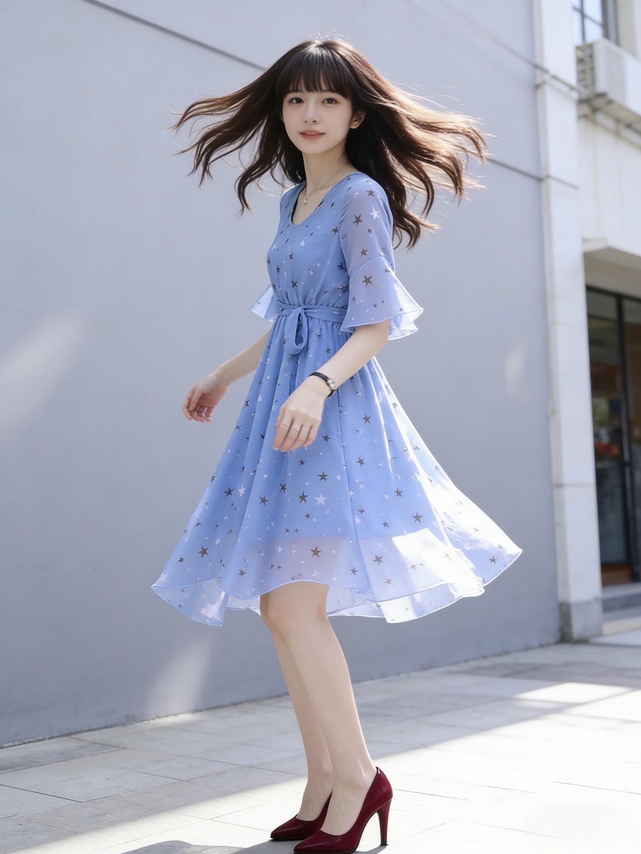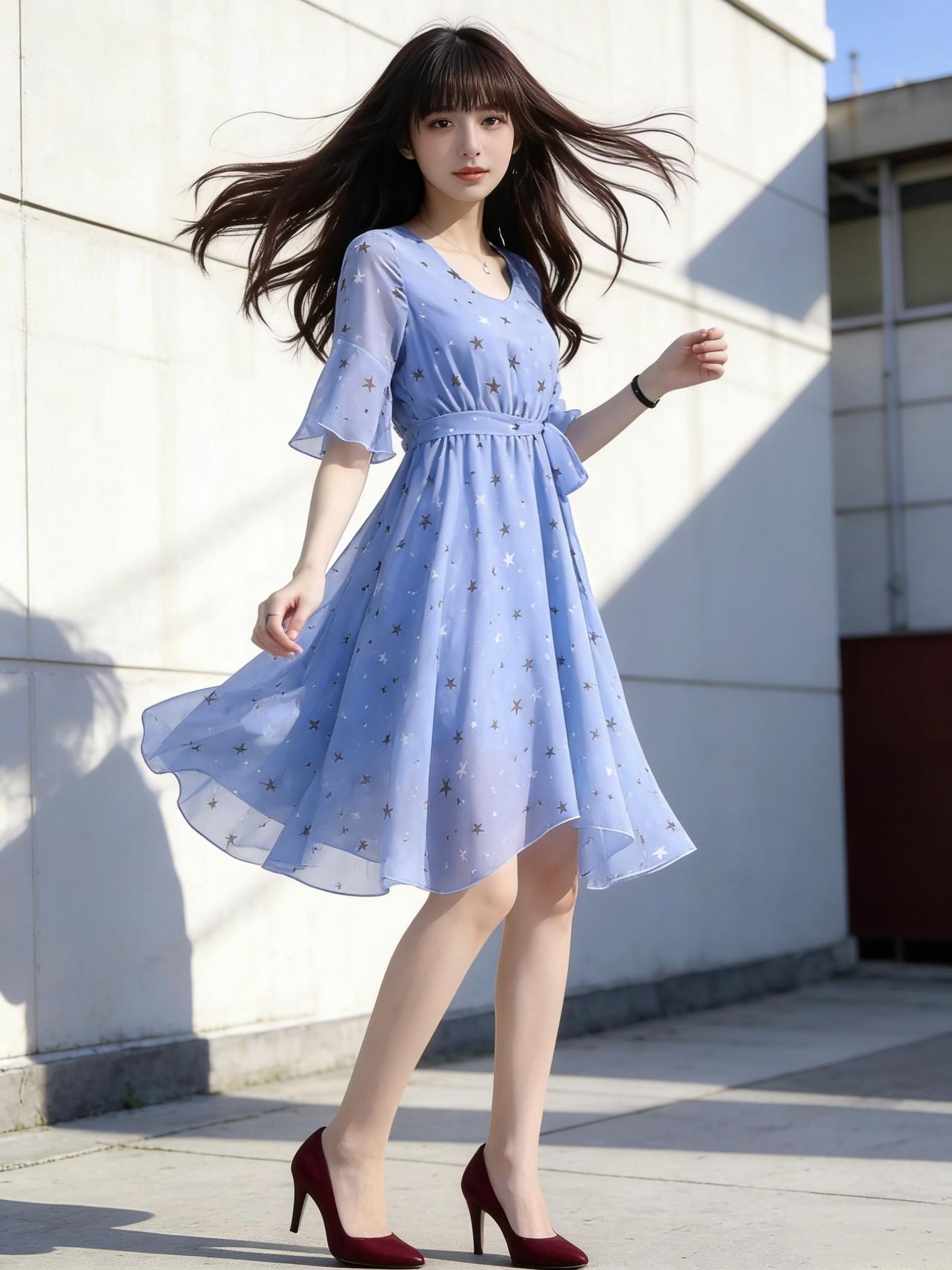 轻盈飘逸的蓝裙,搭配红高跟鞋,甜美又优雅!女生怎么穿搭会看上去很优雅 淡雅蓝裙照 浅色蓝裙穿搭 梦幻蓝裙造型