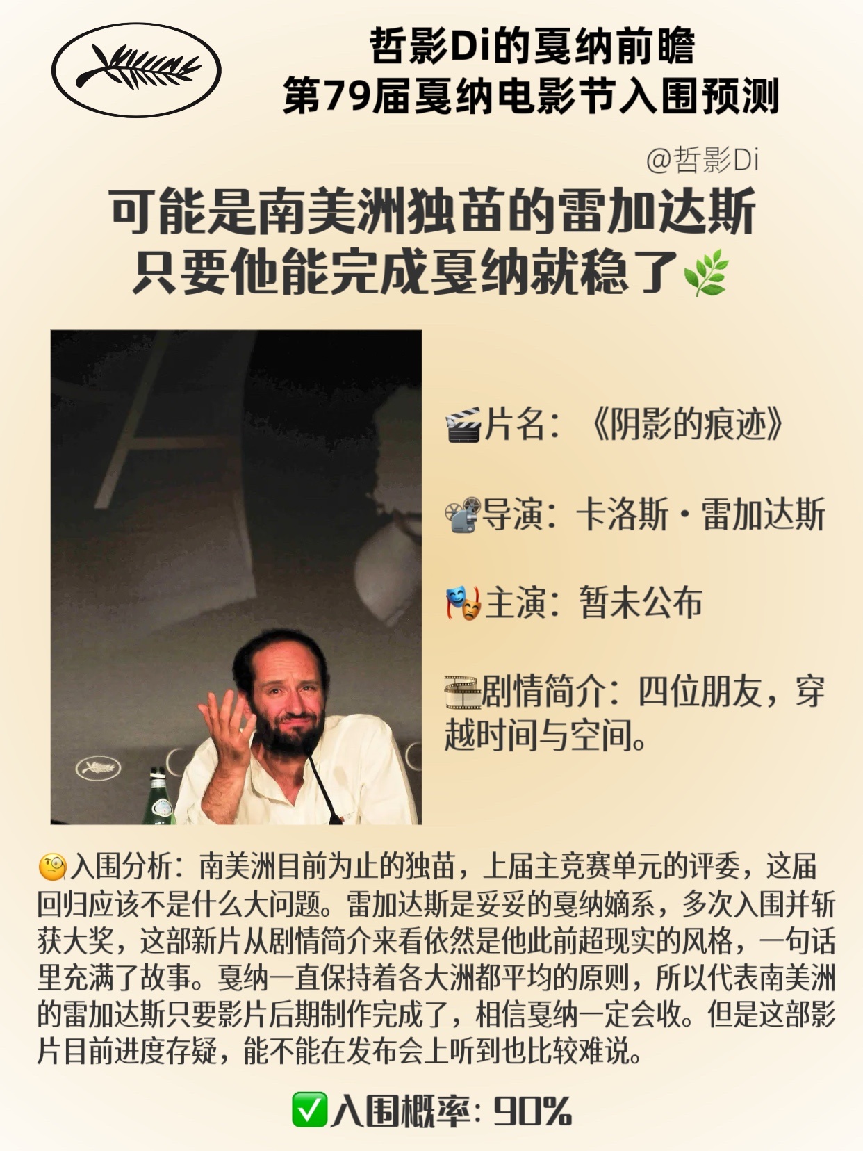 🧐入围分析:南美洲目前为止的独苗,上届主竞赛单元的评委,这届回归应该不是什么大问题。雷加达斯是妥妥的戛纳嫡系,多次入围并斩获大奖,这部新片从剧情简介来看依然是他此前超现实的风格,一句话里充满了故事。戛纳一直保持着各大洲都平均的原则,所以代表南美洲的雷加达斯只要影片后期制作完成了,相信戛纳一定会收。但是这部影片目前进度存疑,能不能在发布会上听到也比较难说。✅入围概率:90%