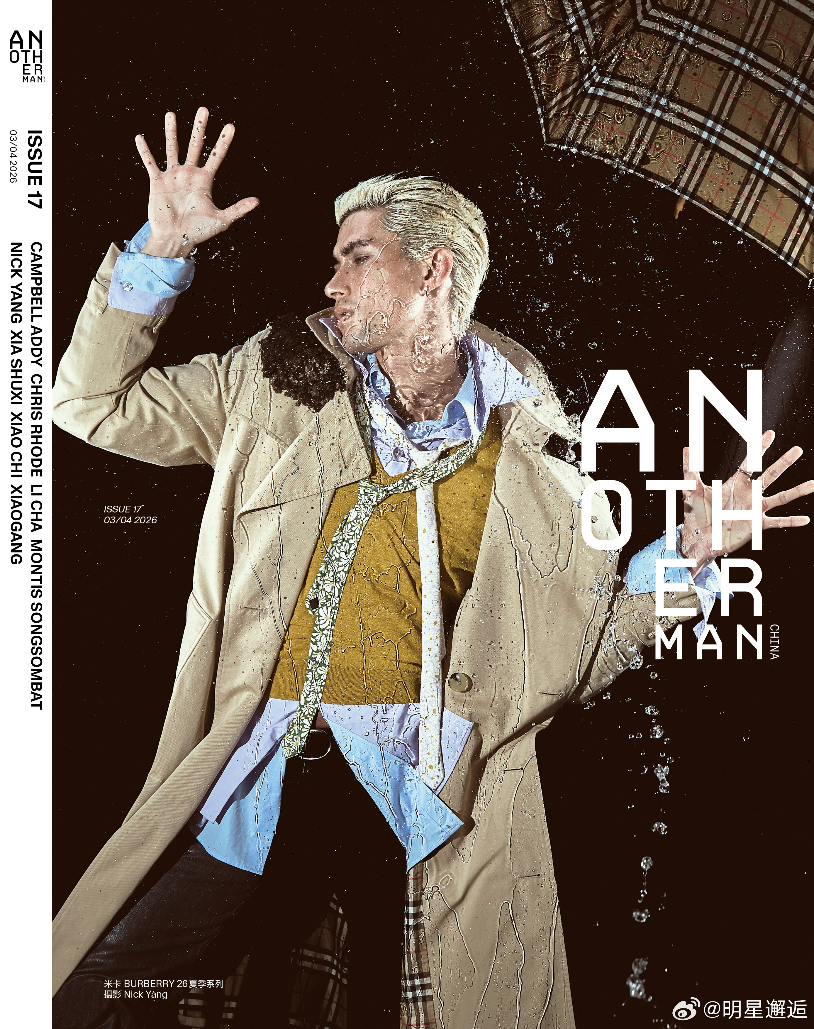 米卡AnotherMan开季封面米卡登上时尚杂志AnotherMan开季封面,金发造型搭配Burberry 2026夏季系列,复古风衣、亮面皮衣多风格切换。