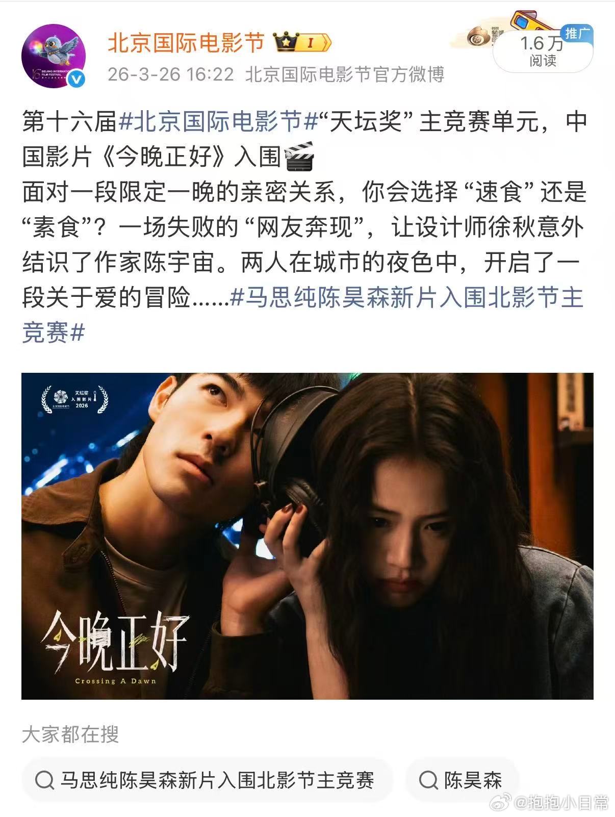 马思纯陈昊森新片这么猛吗恭喜《今晚正好》入围北影节天坛奖!设计师和作家之间因为失败的网友奔现而开启的爱的冒险,好新颖的设定。坐等首映,期待两位演员的精彩表现!第十六届北影节主海报发布北京国际电影节
