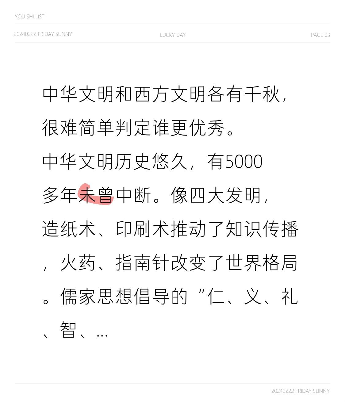 中华文明历史悠久,有5000多年未曾中断。像四大发明,造纸术、印刷术推动了知识传播,火药、指南针改变了世界格局。儒家思想倡导的“仁、义、礼、智、信”影响着人们的价值观。