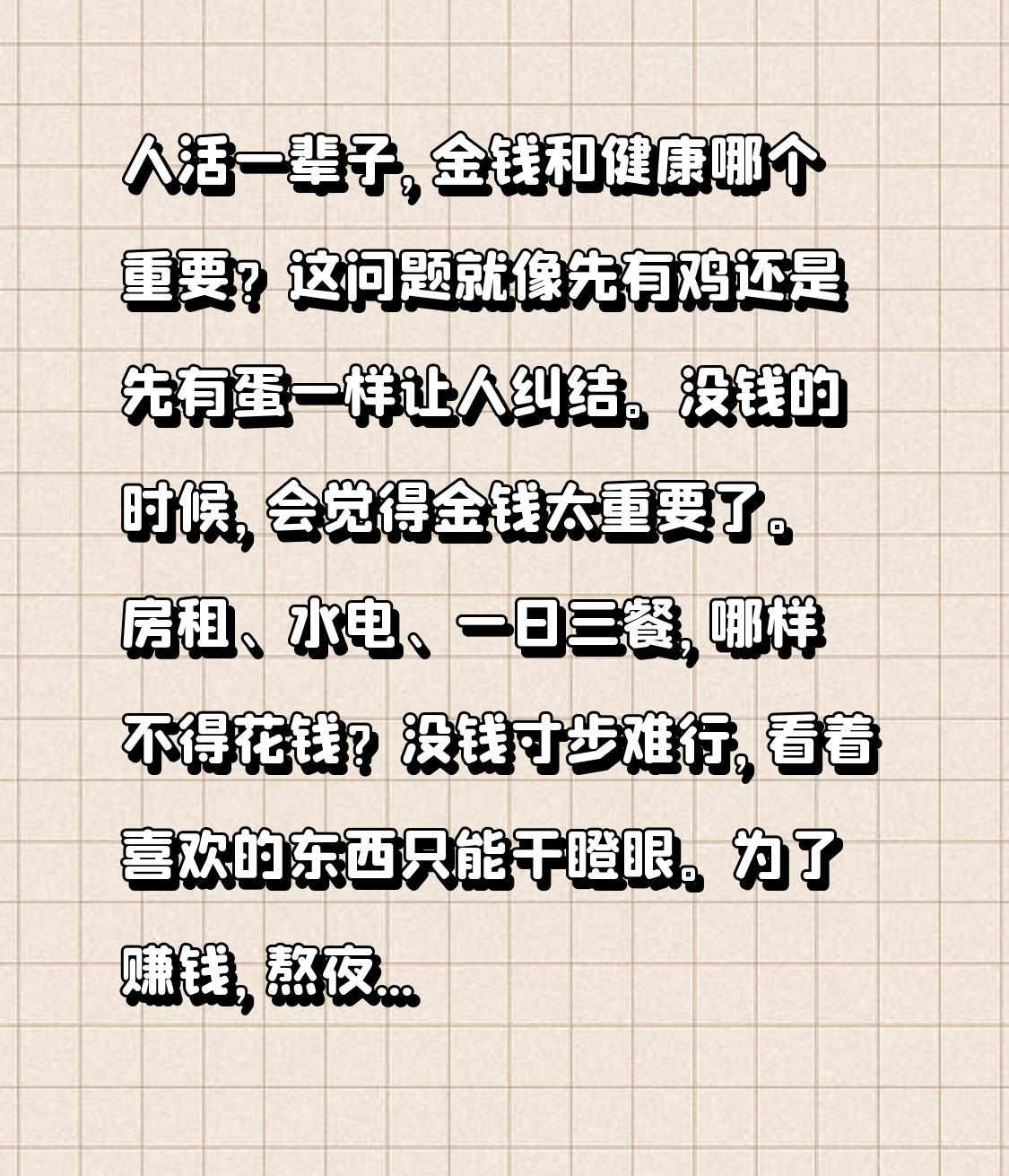 人活一辈子,金钱和健康哪个重要?这问题就像先有鸡还是先有蛋一样让人纠结。