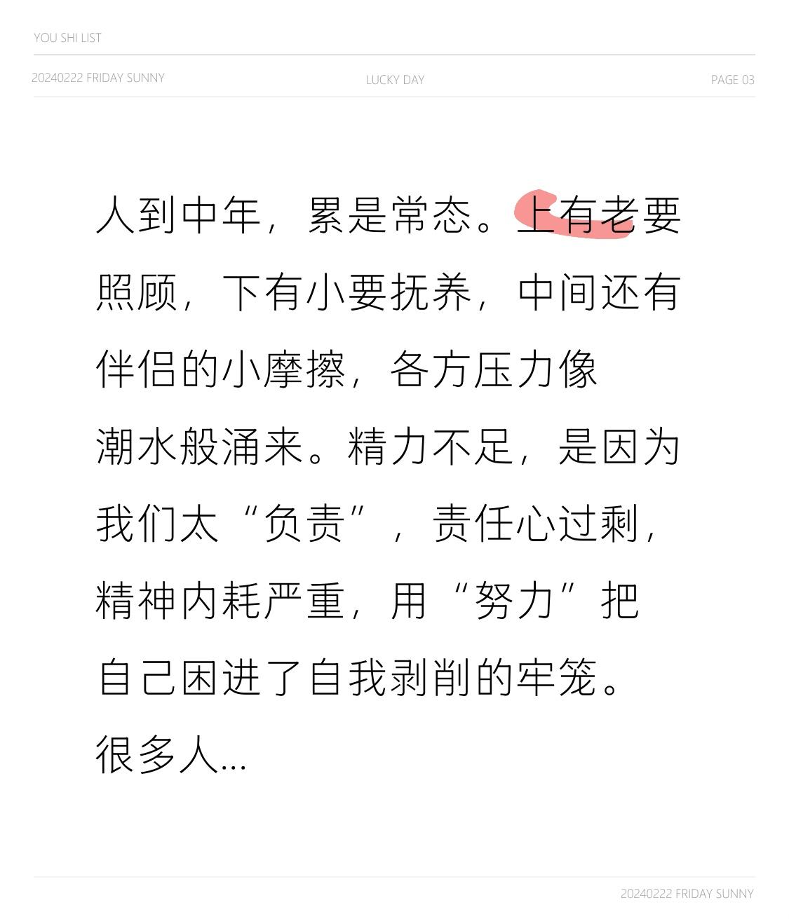 人到中年,累是常态。上有老要照顾,下有小要抚养,中间还有伴侣的小摩擦,各方压力像潮水般涌来。精力不足,是因为我们太“负责”,责任心过剩,精神内耗严重,用“努力”把自己困进了自我剥削的牢笼。