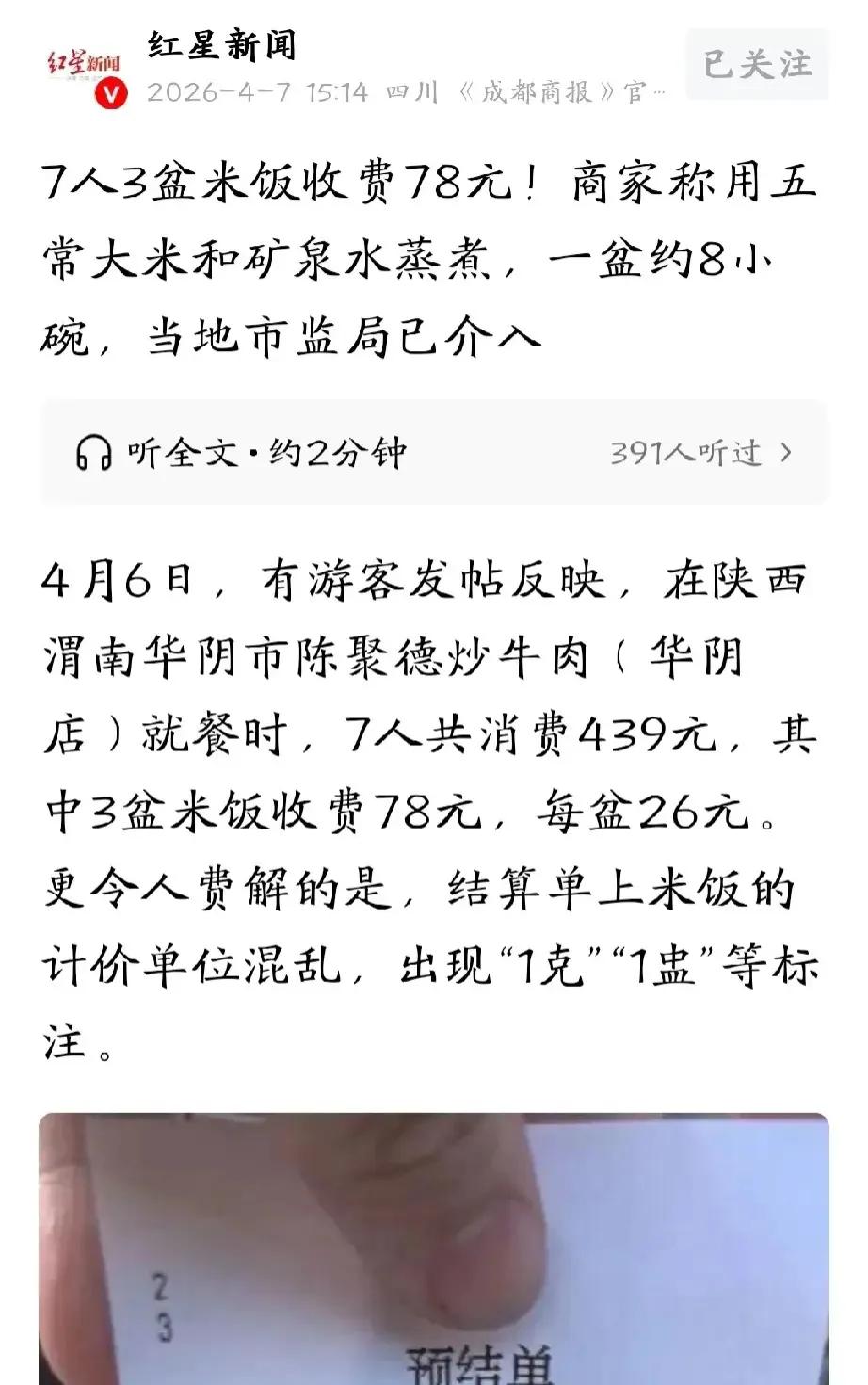 陕西渭南,7名游客爬完华山到一家餐馆吃饭,几人饿坏了,点了三盆米饭和一些菜,总消费439元。结账时,游客突然发现,三盆米饭收费竟要78元,简直太贵了,而且,菜单上只写了一小碗3块,根本没写一盆的价格。店家解释说,他们用的五常大米和矿泉水蒸煮,一盆约8小碗,不存在乱收费一说。游客无法接受,向市监局投诉。