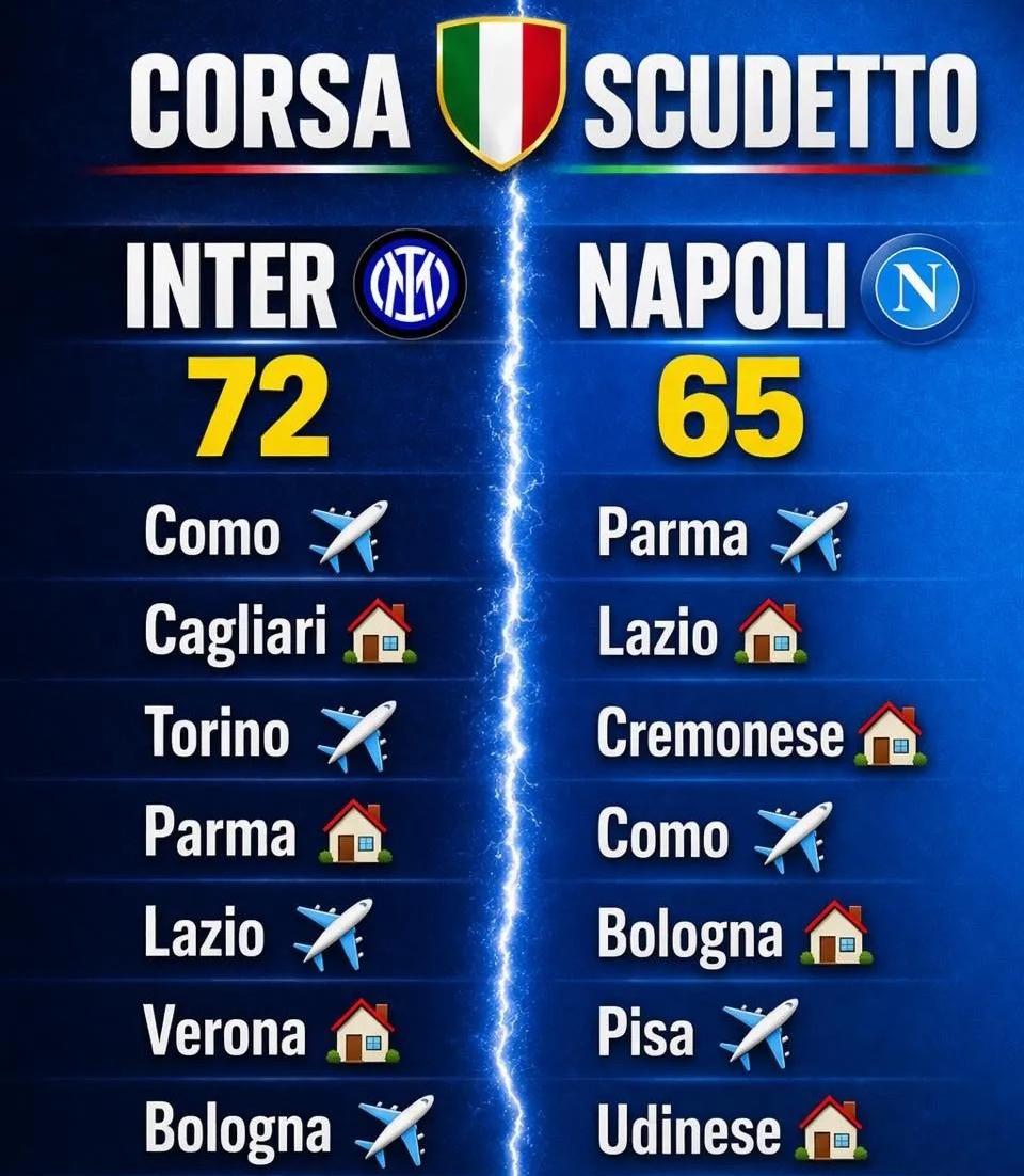 最后7轮,国际米兰与那不勒斯的大决战开始。国际米兰和那不勒斯最后7轮的对手不相上下,其中有帕尔马、科莫、拉齐奥和博洛尼亚四个相同的对手。在最后7轮国际米兰理论上只要获取15分将稳夺意甲冠军,但国际米兰只要稳扎稳打做好自己,全力以赴,全身心拿下意甲第21冠,毕竟7轮7分是一个巨大的优势。