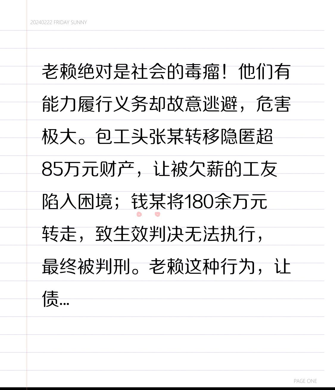 包工头张某转移隐匿超85万元财产,让被欠薪的工友陷入困境;钱某将180余万元转走,致生效判决无法执行,最终被判刑。老赖这种行为,让债权人痛苦,还挑衅司法权威,让法院判决成“白条”。若“赢了官司拿不到钱”成常态,谁还信法律?