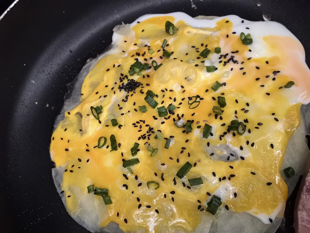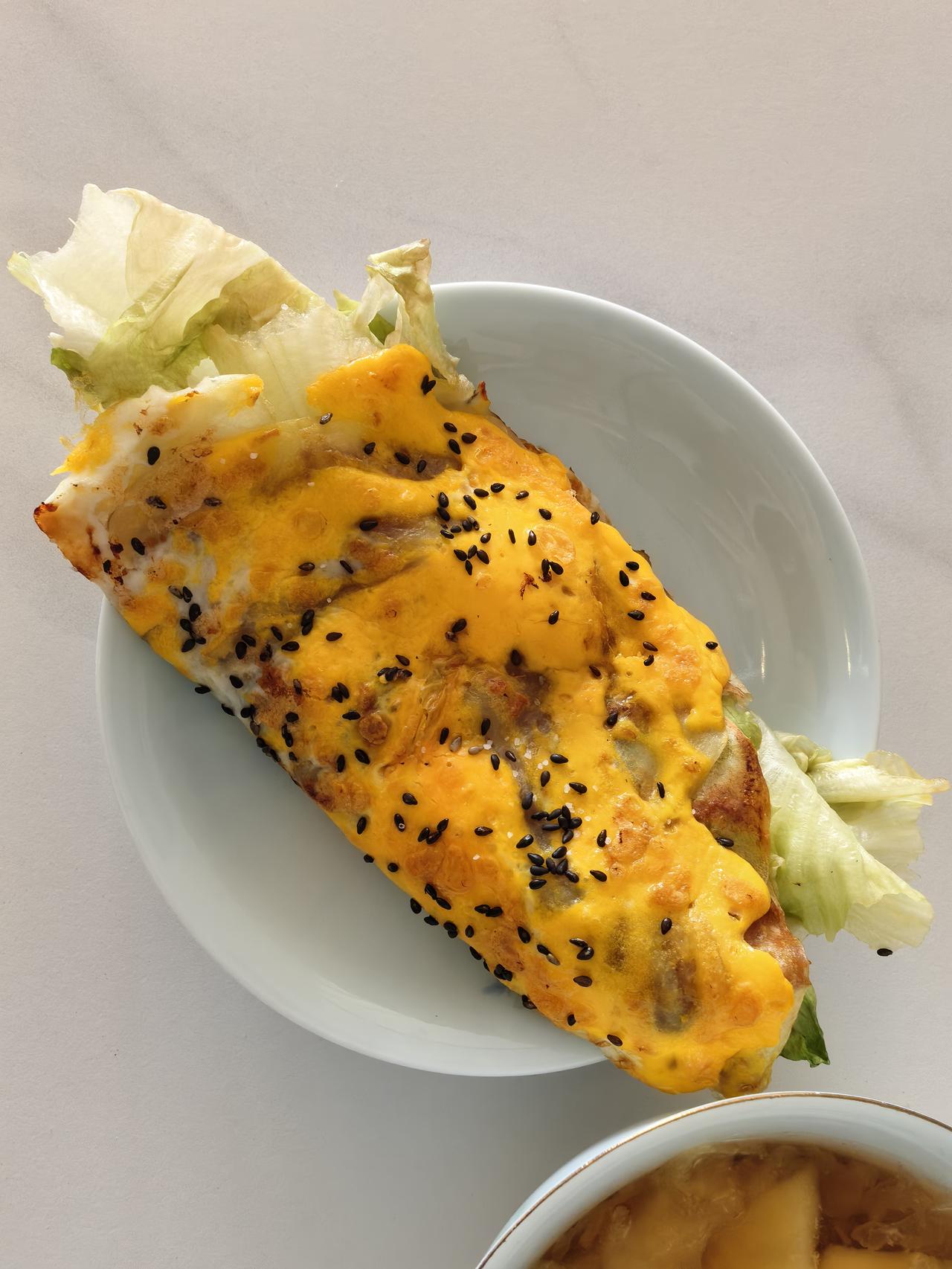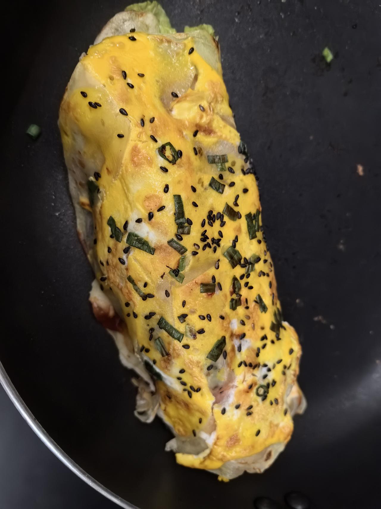 把土豆削皮后,一片片削入不粘锅里,整理成圆片,喷点油,开火煎两分钟,然后打入鸡蛋,撒上黑芝麻和葱花,翻面抹上甜面酱,找出午餐肉罐头,切两片放上面,生菜一片,再拿出吃剩的几片薯片放上面,然后卷起来。