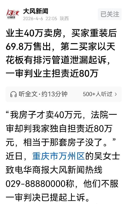 重庆万州,女子因搬家以40万的价格,卖掉了154平的学区房,买家装修后,以69.8万卖给了另一买家。万万没想到,过户7个月后,女子和第一买家,双双被第二个买主告上法庭,称房子的刻意隐瞒重要事实,使她受到欺诈,要求赔偿损失。岂料,法院一审排除第一买主,要求女子独自返还69.8万元购房款,和其他费用,总共大约80万元。女子不服判决,自己40万卖掉的房子,如今却要赔出将近80万,等于搭进去一套房子? 吴女士在万州有一套154平的学区房,地段不错,周边有全区顶尖的中小学和幼儿园,这套房是2008年买的,登记在她丈夫和儿子名下,这些年一直出租给别人开美容院、宾馆,算是家里的一套闲置资产。 2024年5月,因为家里要搬家,吴女士打算把这套房子卖掉,通过中介牵线,她和买家朱女士谈妥了价格,40万成交。 按理说,一手交钱一手过户,交易完成就万事大吉,可朱女士提出,暂时不办理过户,吴女士也没多想,觉得反正钱到手了,晚一点过户也没关系。 更关键的是,为了图省事,吴女士还专门去公证处办了全权委托公证,把签合同、办过户、缴税费等所有和卖房相关的事宜,全都委托给了朱女士。 吴女士当时心里肯定还美滋滋的,觉得自己捡了个省心的买卖,不用跑前跑后办手续,安安稳稳拿到40万房款就好。 可她万万没想到,自己这个“省事”的操作,后来竟把自己拖进了深渊。仅仅过了两个多月,朱女士简单装修了一下这套房子,转头就以69.8万的价格,把房子卖给了另一位买家向女士,一进一出,净赚了19.8万的差价。 因为有吴女士的全权委托,朱女士后续卖给向女士的所有过户手续,都是以吴女士代理人的身份办理的,吴女士一家人从头到尾都没出过面,也完全不知道朱女士已经把房子转卖了。 2024年12月底,房子顺利过户到向女士名下,吴女士还以为这件事彻底了结了,拿着40万房款,丝毫没意识到,一场官司正在等着她。 过户7个月后,也就是2025年7月,吴女士突然收到了法院的传票,她和第一买家朱女士,双双被第二个买主向女士告上了法庭。 向女士在起诉状里说,自己入住后发现,这套房子的客厅天花板上方,有整栋楼的排污主管道,而且管道存在渗漏问题,臭气熏天,根本无法正常入住。 她认为,吴女士和朱女士在交易过程中,刻意隐瞒了这个重要事实,对她构成了欺诈,要求两人返还购房款并赔偿所有损失,算下来总共将近80万元。 接到传票的吴女士彻底懵了,她怎么也想不通,自己都把房子卖出去大半年了,怎么还会被起诉?更让她无法接受的是,法院一审判决下来,直接排除了第一买家朱女士的责任,要求她独自返还向女士69.8万元购房款,再加上资金占用利息、过户税费、中介费和律师费等所有费用,总共大约80万元。 其实,法院之所以这么判,核心原因就出在吴女士当初办的那份全权委托公证上。很多人可能不知道,全权委托在法律上意味着什么,根据《民法典》第162条,代理人在代理权限内以被代理人名义实施的民事法律行为,对被代理人发生效力。 简单说,吴女士把所有权限都委托给了朱女士,朱女士的所有行为,包括隐瞒管道渗漏的问题,在法律上都等同于吴女士自己做的,哪怕吴女士本人什么都不知道、什么都没做,责任也得由她来承担。 法院审理时查明,早在2024年,物业就曾起诉过租吴女士房子开宾馆的老板,原因是老板拖欠物业费,而老板当时辩解,是因为房屋排污主管道漏水,给宾馆造成了损失,所以才拒交物业费,这件事后来还通过调解解决了。 这就意味着,吴女士其实是知晓管道有渗漏问题的,而她没有主动告知任何一位买家,再加上朱女士作为她的代理人,用装修掩盖了问题,法院就认定,吴女士存在欺诈故意,构成了欺诈。 这件事给所有想卖房的人提了个醒,二手房交易真的没有那么简单,千万不要图省事就办理全权委托,因为你永远不知道代理人会做什么,一旦出了问题,所有的责任都得你自己扛。 还有,房屋的任何瑕疵,哪怕是曾经出现过、后来修好了的问题,都要主动告知买家,不然就算你没有故意欺诈的想法,也可能被认定为隐瞒事实,最终承担巨额赔偿。