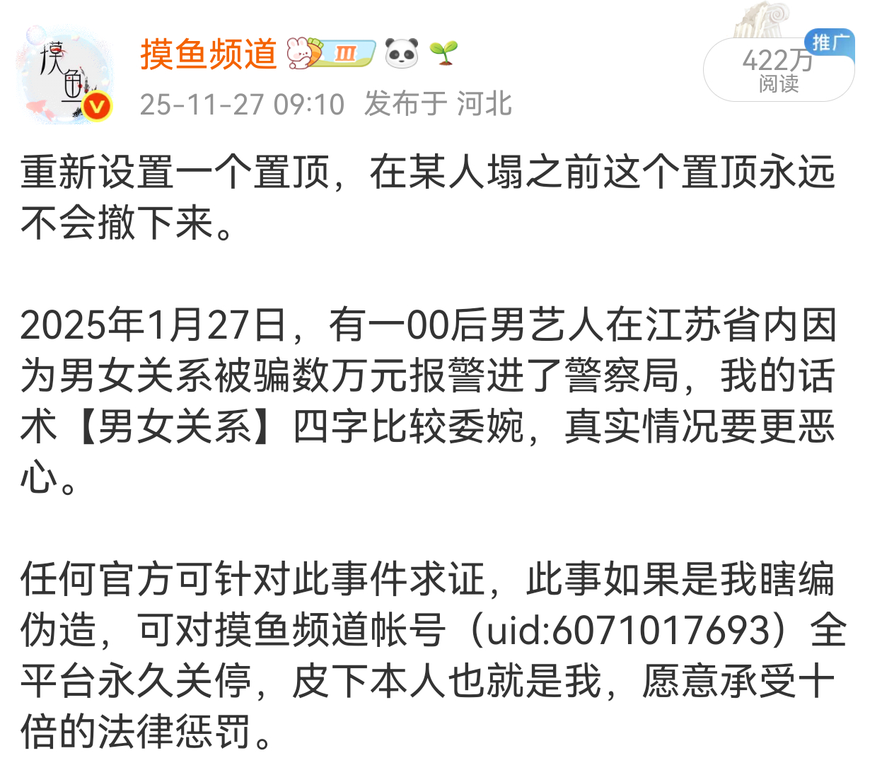 现在还信我自己是造谣的粉丝,父母可以再生一个了,艾特官方说自己配合调查,400多万传播度,地点精确到二字,00后,娱乐圈艺人,连云港,涉案金额具体到5万一,时间具体到2025年1月27日,这个线索指向和说大名有什么区别。