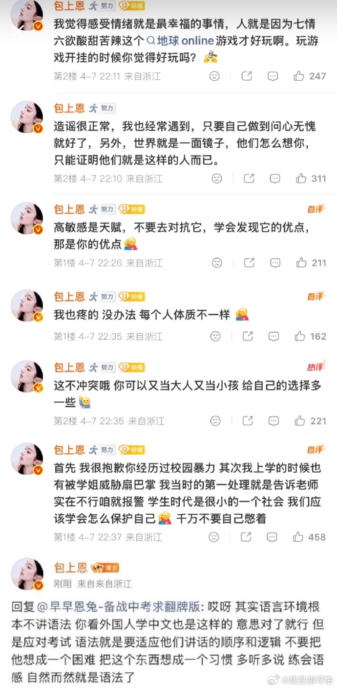 包上恩安慰粉丝的话看得人心软软的,像一个懂你委屈的朋友,很温柔又很有力量,就是想不到包上恩上学时期也会遇到被学姐威胁扇巴掌的事情