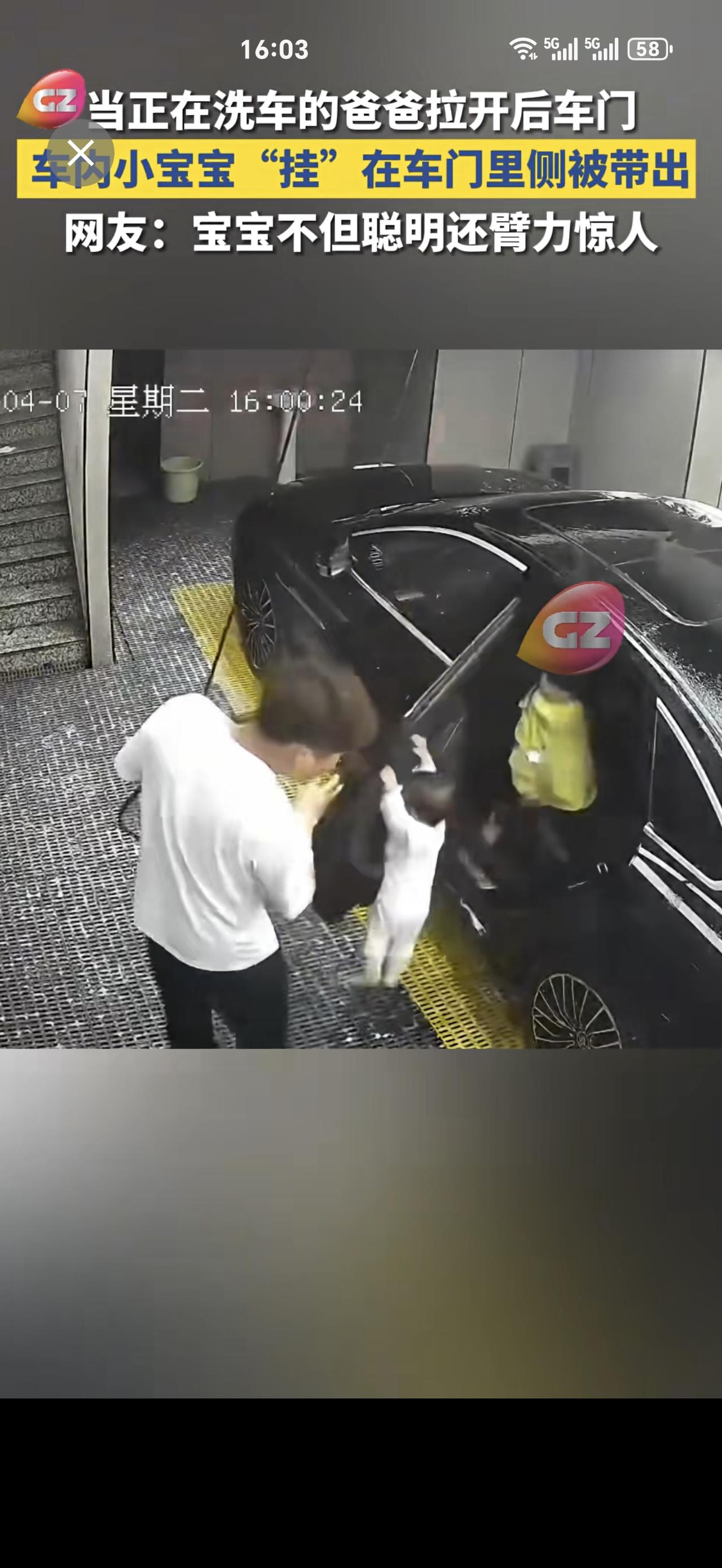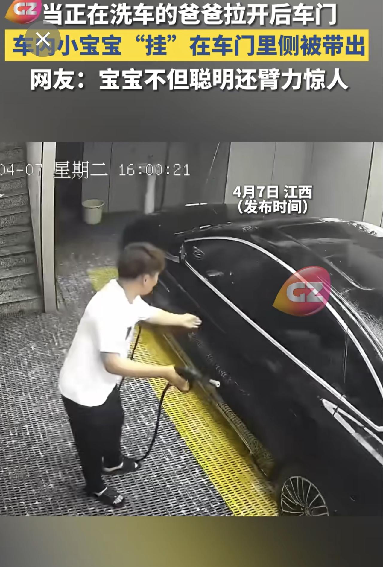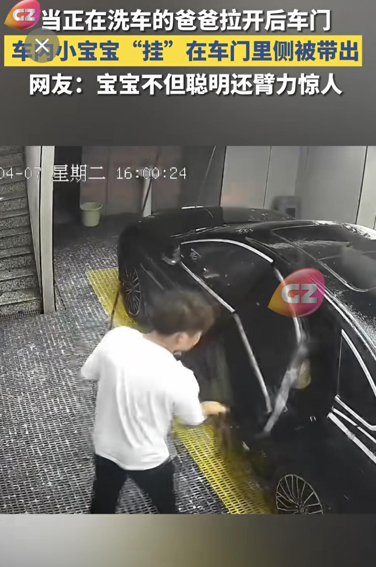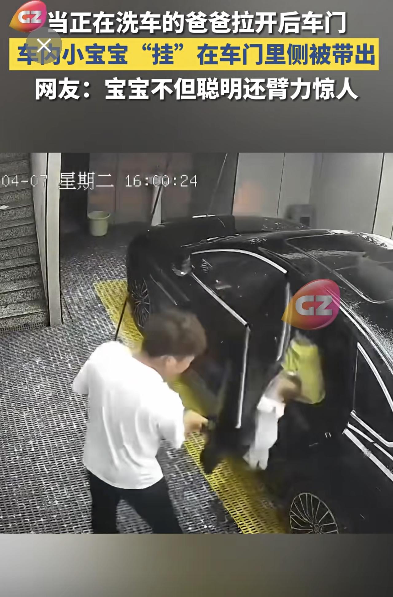 当正在洗车的爸爸拉开后车门,车内小宝宝“挂”在车门里侧被带出,网友:宝宝不但聪明