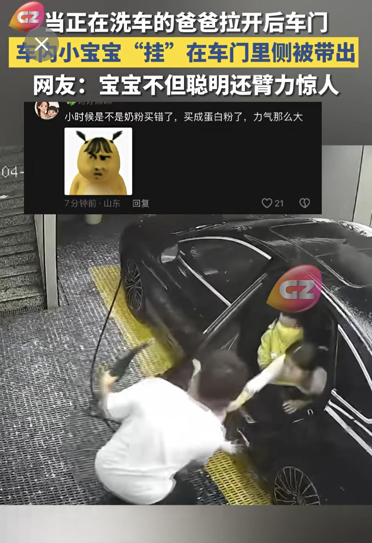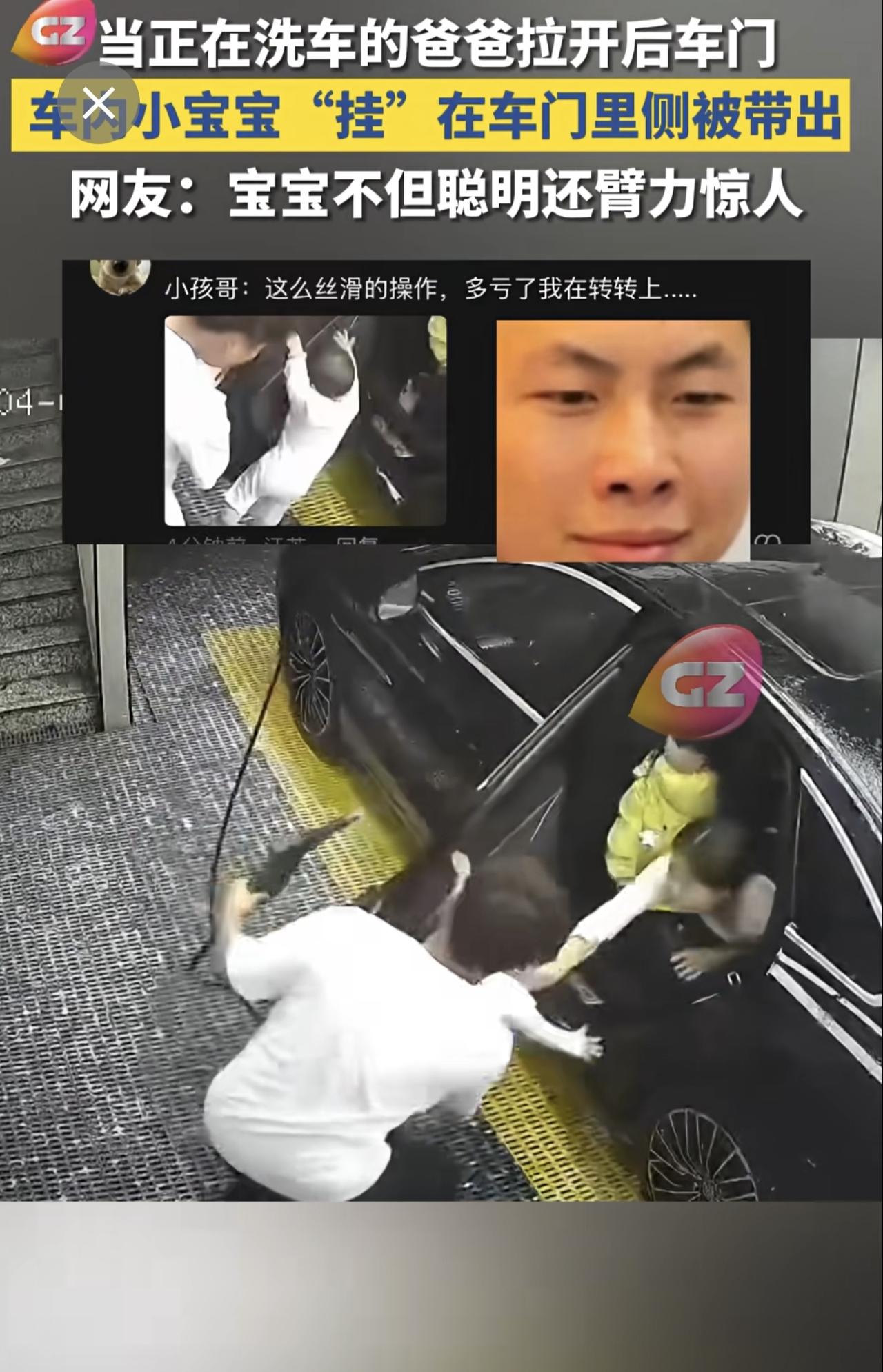 当正在洗车的爸爸拉开后车门,车内小宝宝“挂”在车门里侧被带出,网友:宝宝不但聪明还臂力惊人。萌娃