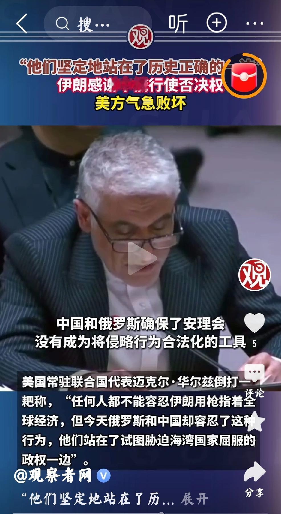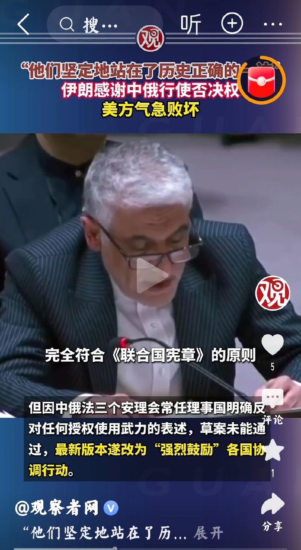 2026年4月8日,观察者网报道:“当地时间4月7日,联合国安理会就巴林提交的一项涉及霍尔木兹海峡决议草案进行表决,草案拟“强烈鼓励”利用该海峡商业航道的国家开展防御性协调行动。由于常任理事国中国和俄罗斯行使否决权,该决议草案没有获得通过。伊朗感谢中俄行使否决权,而美方代表气急败坏。”