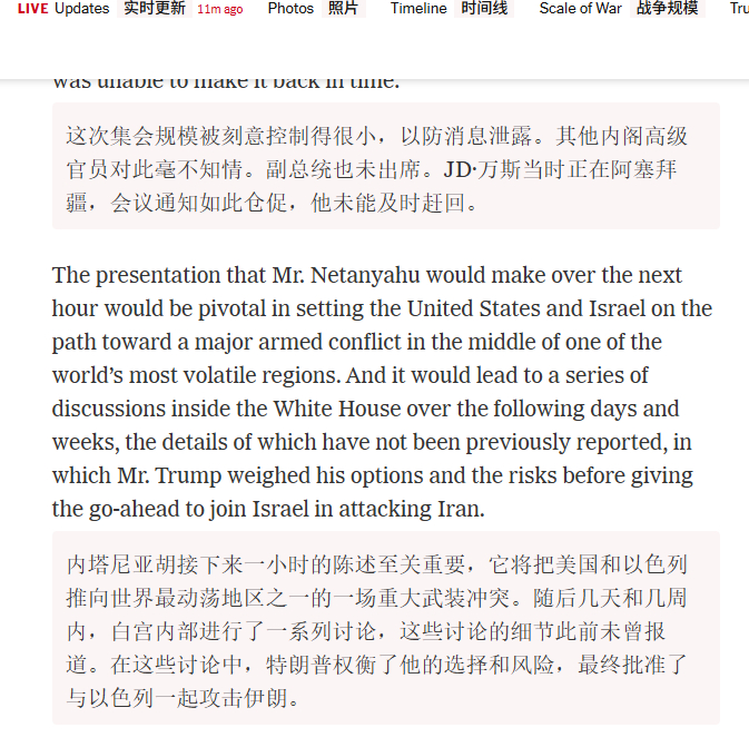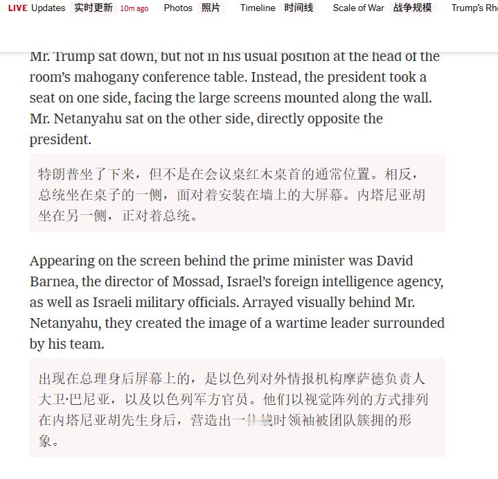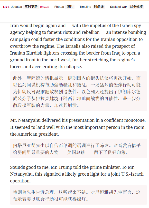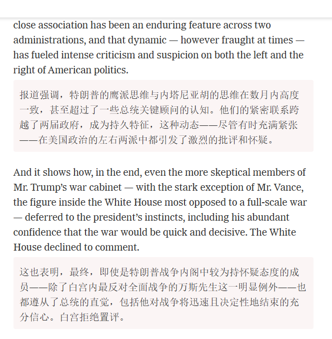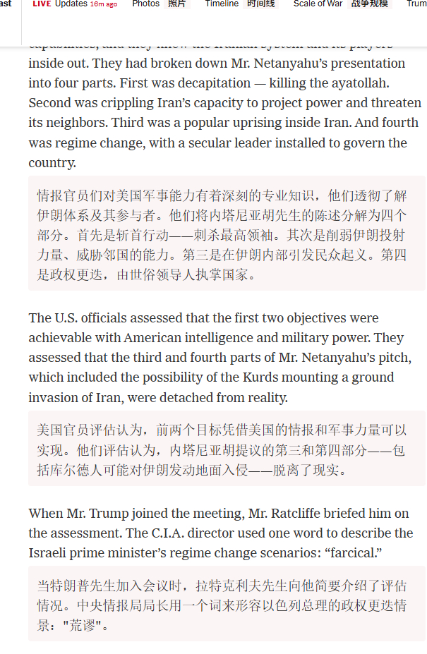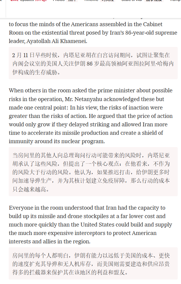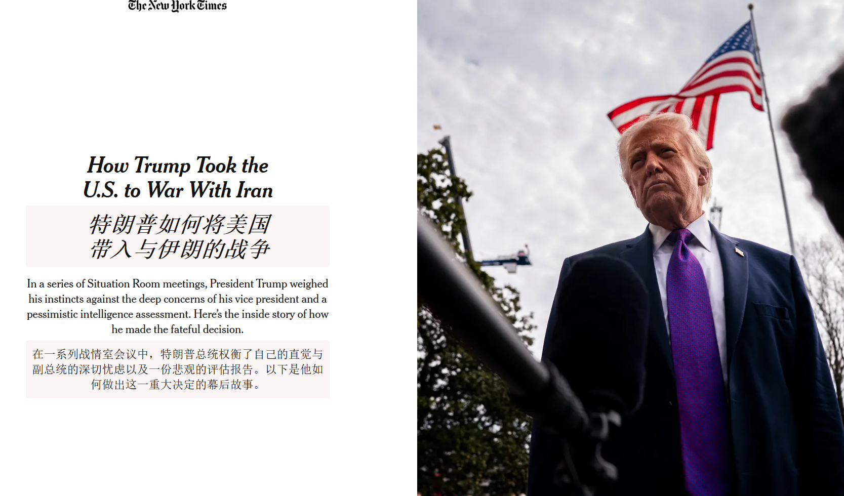🔻纽约时报写了篇文章:《特朗普为什么打伊朗》,文章是这么写的,我给大家总结一下:🔻2月11日,内塔尼亚胡到白宫,给特朗普看了个以色列人做的视频,视频说:“只要炸死哈梅内伊,小巴列维就能上位,几周内就能摧毁伊朗人的导弹,以至于伊朗人根本无力封锁霍尔木兹海峡,所以也不会打击邻国的美国利益了,摩萨德已经在伊朗做了很多工作,本军所到之处,伊朗人竭诚欢迎,库尔德人也会立即响应,真可谓占尽天时,那种勃勃生机、万物竟发的境界,犹在眼前。”🔻特朗普看完说:唉哟,不错哦?🔻于是要求美国情报界在不到24小时内评估计划可行性。🔻CIA局长:奇谈怪论,鲁比奥:纯属胡扯,凯恩:假的,骗人的。🔻特朗普:雨庵,你们在说什么啊?🔻特朗普团伙成员:我说总座高见。🔻总之,特朗普认为这将是一场非常迅速的战争——这种印象因六月份美国轰炸伊朗核设施后反应冷淡而得到加强,优势在我,幕僚们的反对给特朗普整逆反了。🔻2月11日的时候,万斯去阿塞拜疆了,回来以后也极力劝阻特朗普不要开打。🔻特朗普:我就不!🔻因为美军突袭马杜罗,让特朗普信心倍增。🔻在内阁中,赫格赛斯是对伊朗采取军事行动的最大支持者,塔克卡尔森也在外部反对特朗普。🔻2月26日(!)的时候,白宫战情室又开会,特朗普问大家怎么看。🔻CIA局长拉特克利夫:“新情报显示哈梅内伊要开会,根据定义的不同,推翻伊朗是可能的。如果我们只是指杀死哈梅内伊,我们或许能做到。”🔻赫格赛斯:“干吧!阁下!”🔻万斯:“你知道我认为这是个糟糕的主意,但如果你想这么做,我会支持你”。🔻苏西怀尔斯:“如果你认为为了美国的国家安全需要采取行动,那么你就应该继续前进”。🔻派大星张振熙:“民众并未投票支持海外冲突。但无论特朗普做出何种决定,都将是正确的。”🔻莱维特:“这是总统的决定,新闻团队将尽力处理此事。”🔻凯恩:“如果总统下令,军方就会执行。”🔻鲁比奥:“如果我们的目标是推翻伊朗,就不该这么做。但如果目标是摧毁伊朗的导弹计划,那是一个我们可以实现的目标。”🔻由于特朗普在军事冒险上的良好记录,特朗普的其他幕僚们决定这一次再次顺从他。🔻特朗普:“优势在我!”🔻于是开打。以色列电视台倒计时轰炸等来停火伊朗接受停火提议海外新鲜事中东现场直击